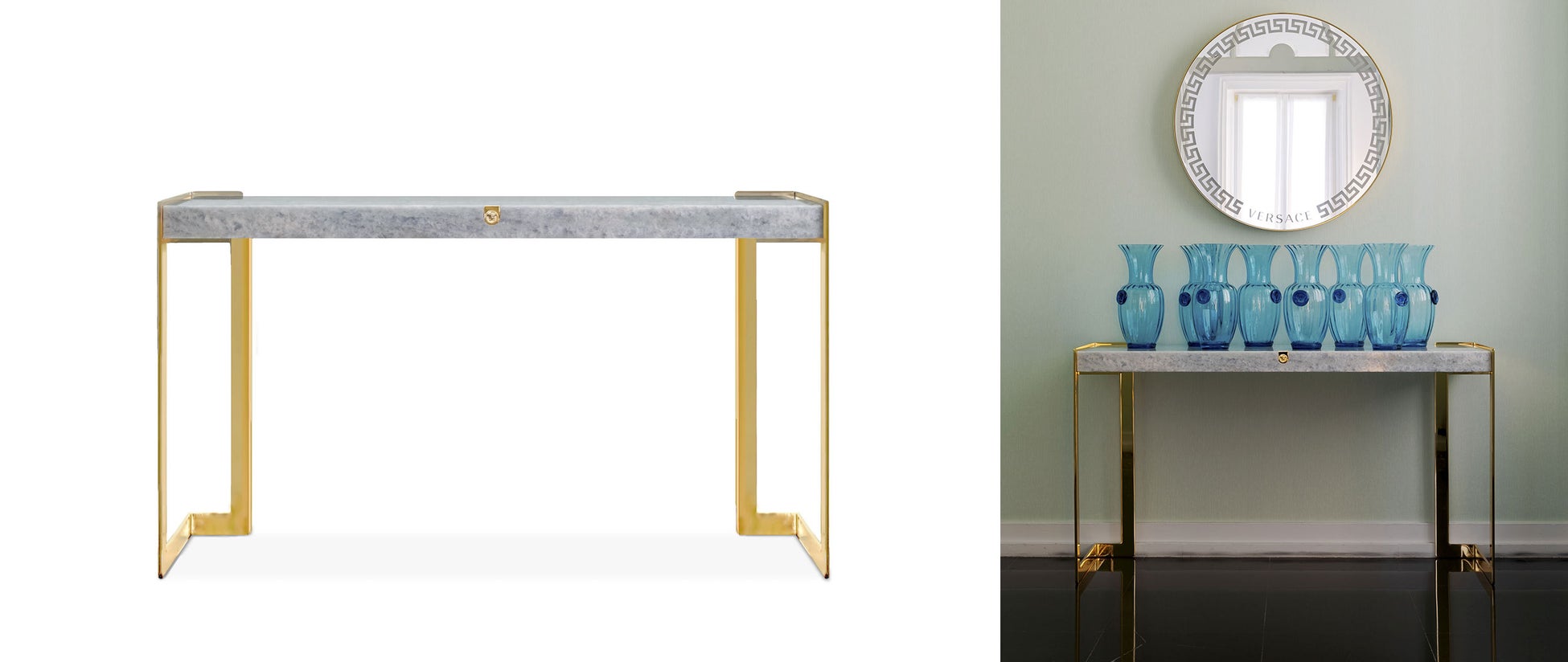 ヴェルサーチェのアトリエ"Palazzo Versace"が軒を構えるミラノのヴィア・ジェズ通りを名前に冠した「ヴィア・ジェズ」コンソール。ブランドの象徴であるメドゥーサの彫刻的モチーフが堂々と据えられ、空間の主役として洗練された印象を放ちます。展示モデルの天板には、希少価値の高いカルサイトの大理石を贅沢に使用。自然が生み出す繊細な模様と淡いブルーの輝きが、ラグジュアリーな雰囲気を一層引き立てています。