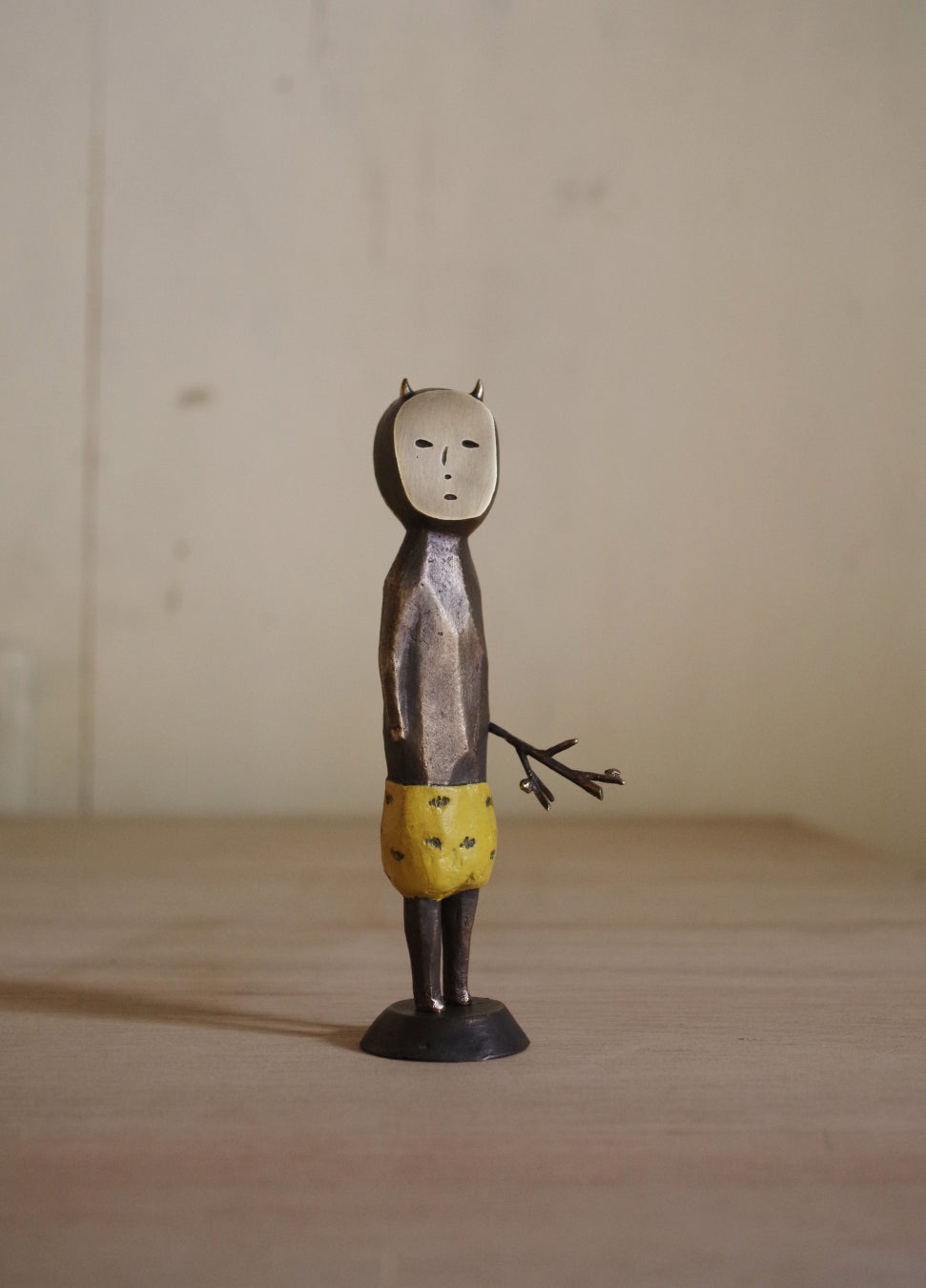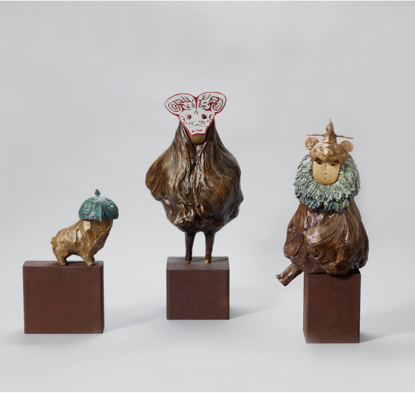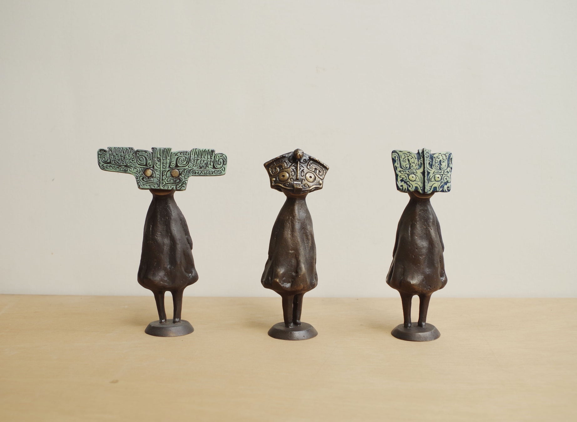 無表情の人型像や茶道具に社会の孤独と祈りを投影し、金属の質量と空洞で精神性を可視化する。今展では「願い」の依代をテーマに、古代中国青銅器の饕餮文を模した面を添え、魔除けと権威の象徴を再解釈する彫刻的作品を発表し、見る者に無意識の願望や恐れを問い掛ける。