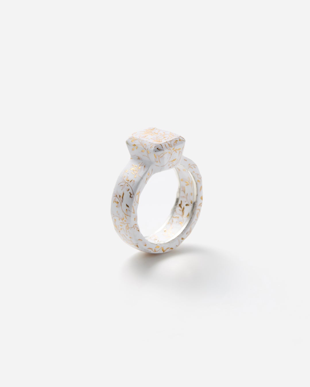 細密な金線と透明釉薬で日用品を詩的な小宇宙へ昇華し、身体と記憶、日常と非日常のあわいをすくい取る。装飾を超えたブローチやリングは静謐な光を放ち、身に着ける者と共鳴する“藝の工藝”の結晶。これまで平山郁夫賞・安宅賞他、卒業制作は藝大美術館買い上げ賞、修了制作はメトロ文化財団賞を受賞している。