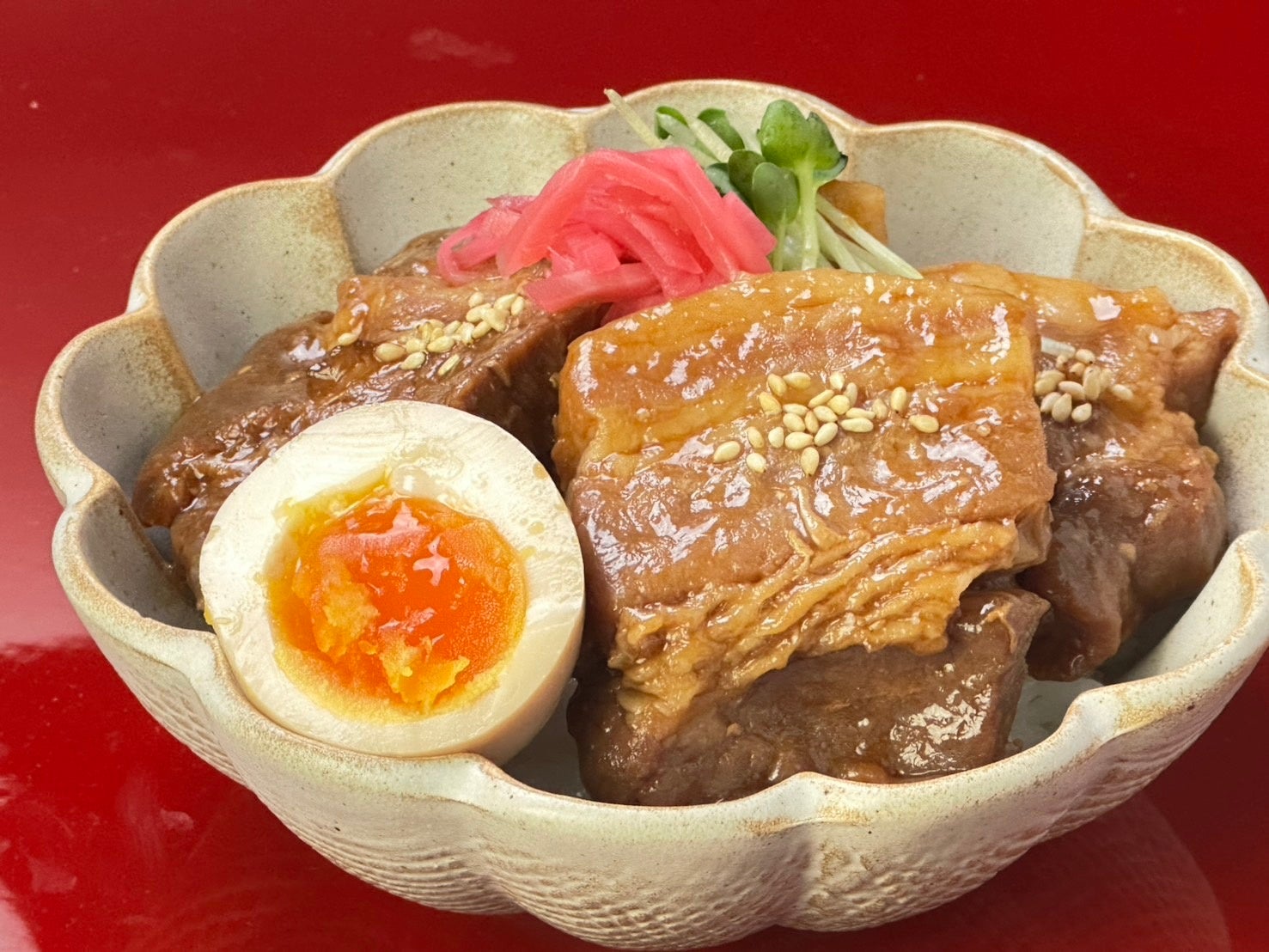 煮込んでも型崩れしにくいバラ肉を使用し、じっくり2時間煮込んでとろけるようなやわらかさを実現しました。表面を焼くことでうまみと香ばしさを引き出し、余分な脂を落とし、肉汁を閉じ込めています。タレは配合を何度も試作し、黒糖タレを配合することでコクのある甘辛いタレに仕上げました。