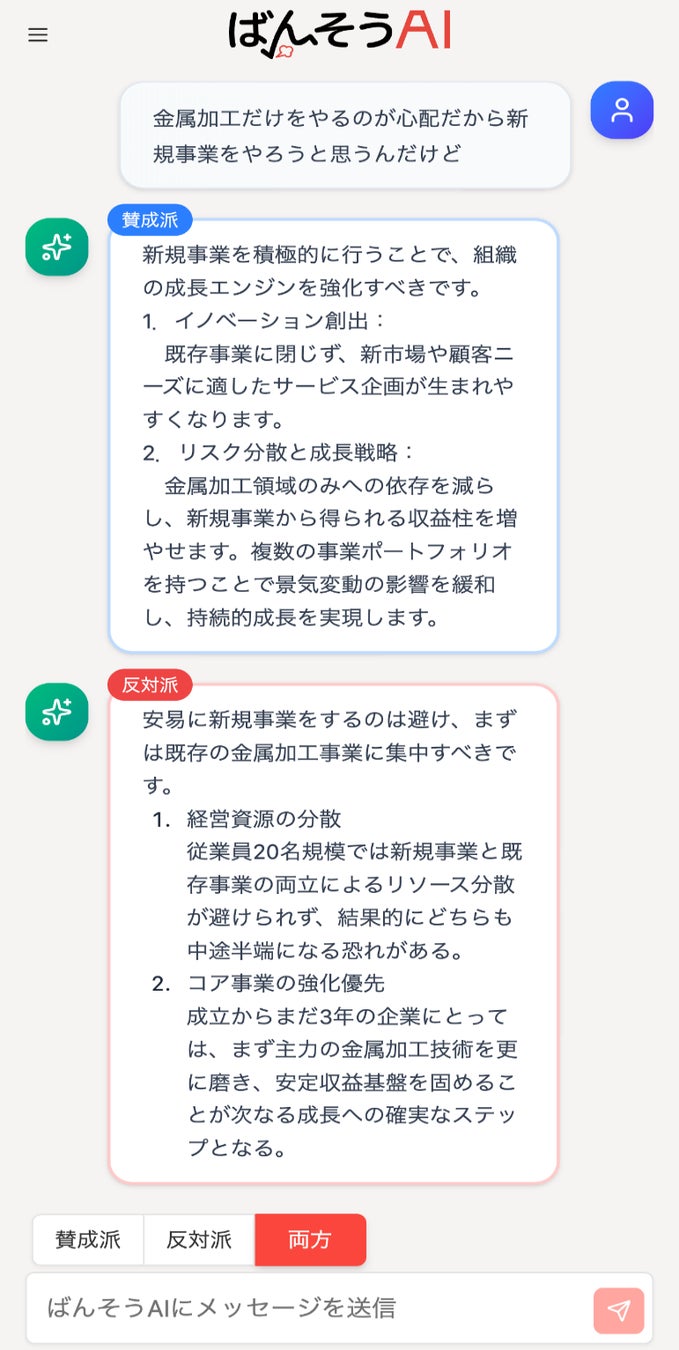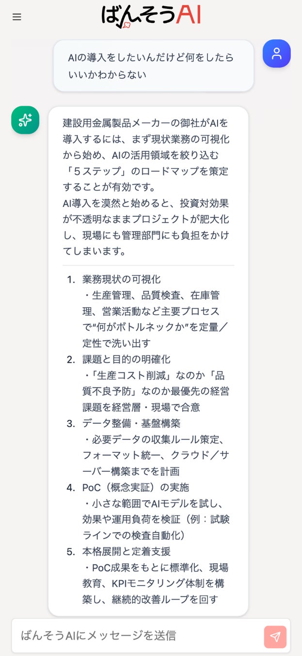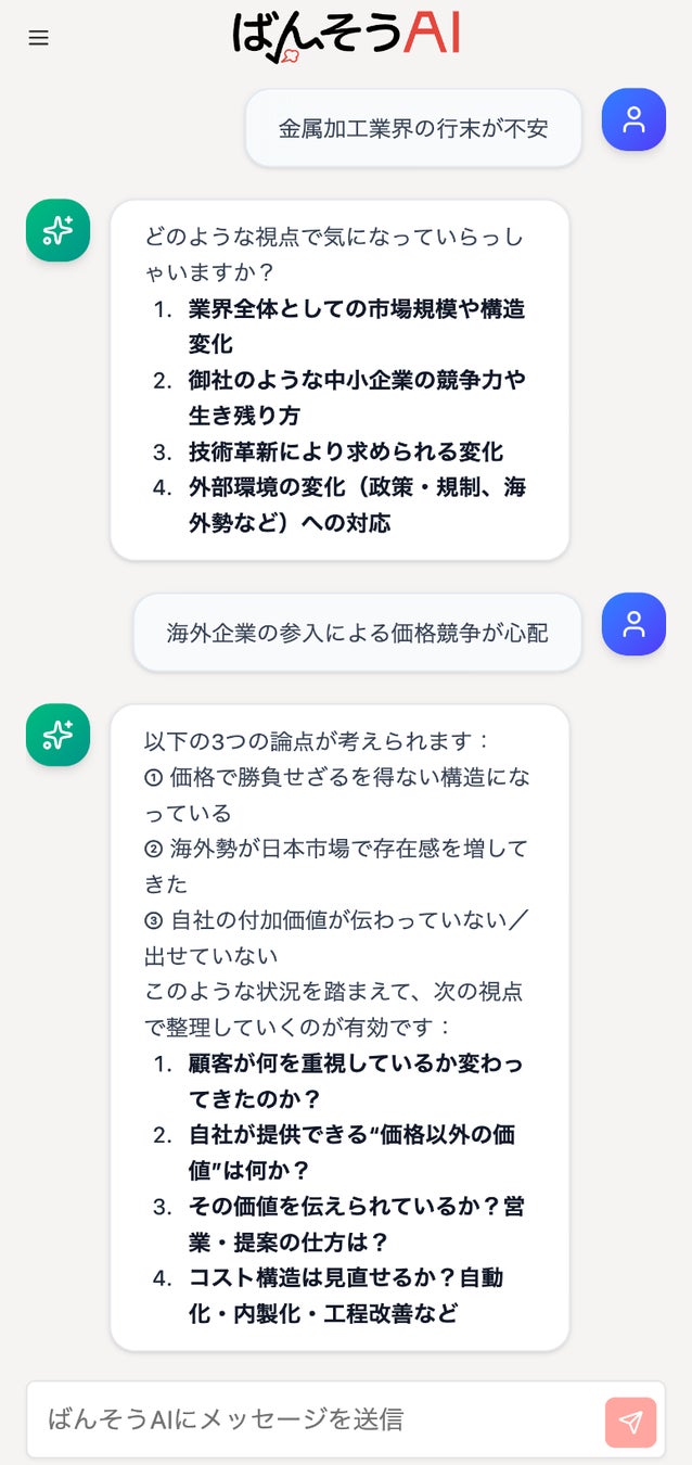 経営者が本当に必要としているのは、答えだけではなく「考えるための視点」「納得感」です。そのため、ばんそうAIは、答えを出すのではなく、問いを返すように設計しました。