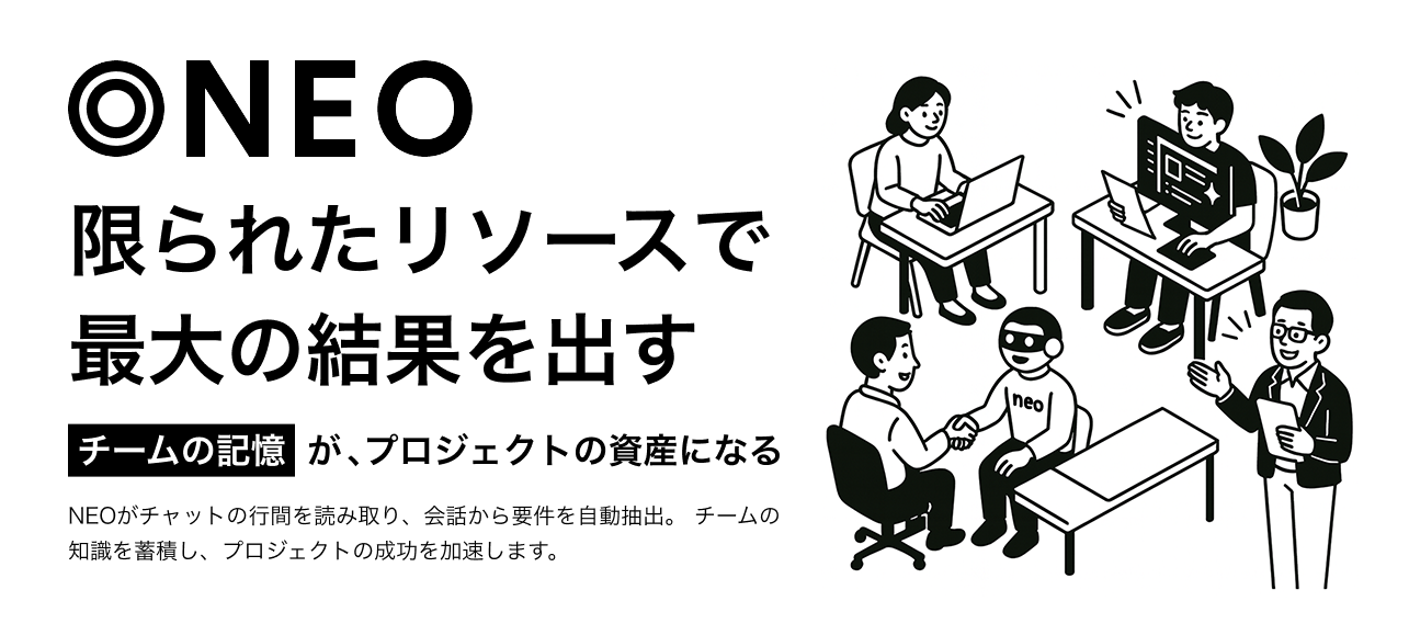 NEOは、チャットや会議などの複数人の会話をリアルタイムで整理・構造化し、必要な情報を即座に活用できる形に変換するクラウドサービスです。