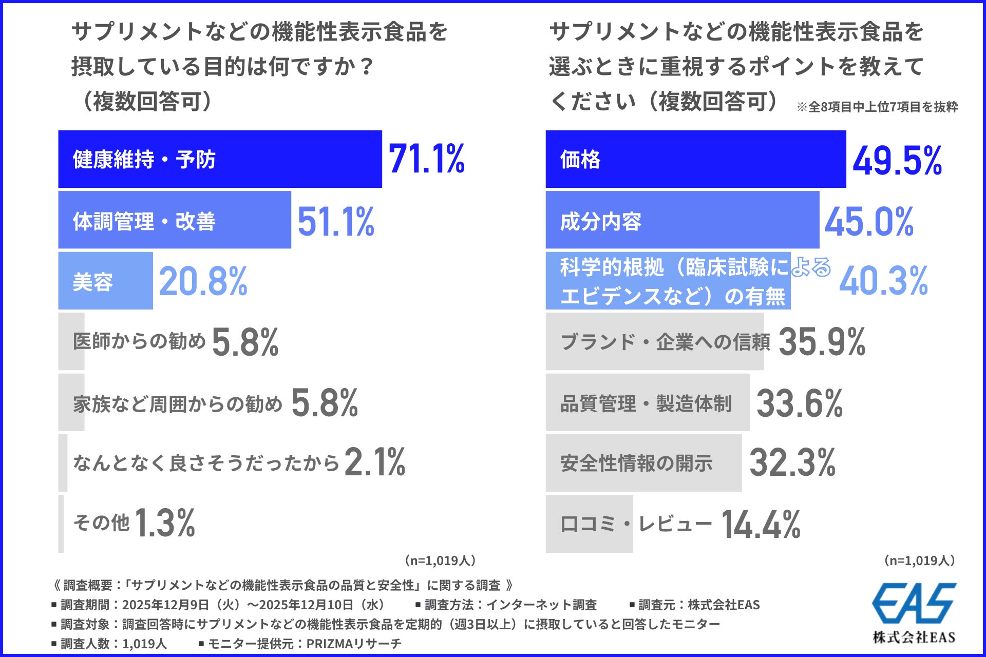 株式会社EAS(本社所在地:神奈川県横浜市、代表取締役:二分 茂礼)は、サプリメントなどの機能性表示食品を定期的(週3日以上)に摂取している方を対象に、「サプリメントなどの機能性表示食品の品質と安全性」に関する調査を行いました。