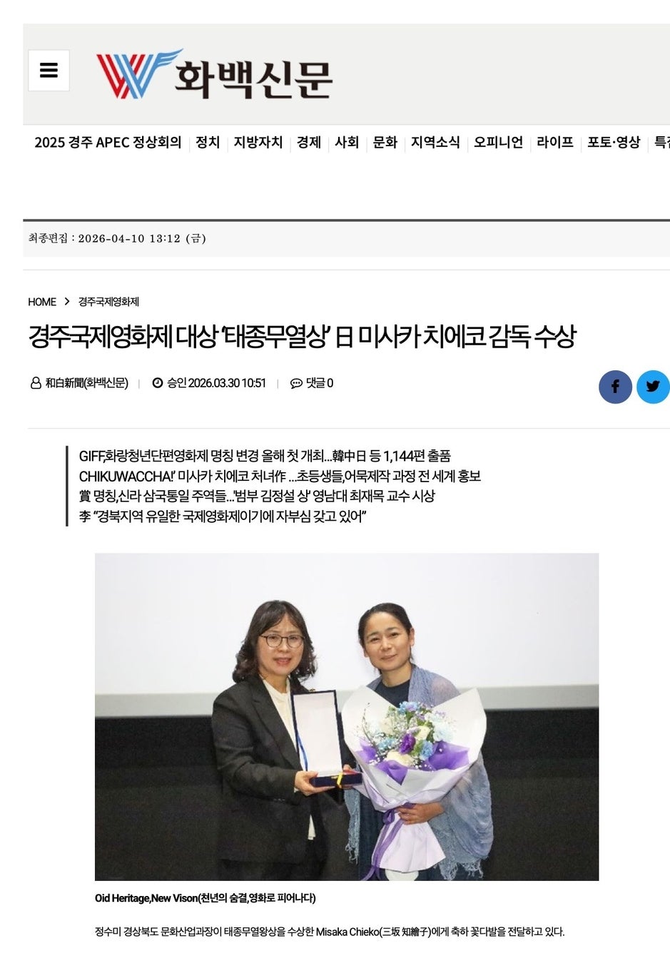タイトル「慶州国際映画祭 大賞“太宗武烈王賞” 日本の三坂知絵子監督が受賞」