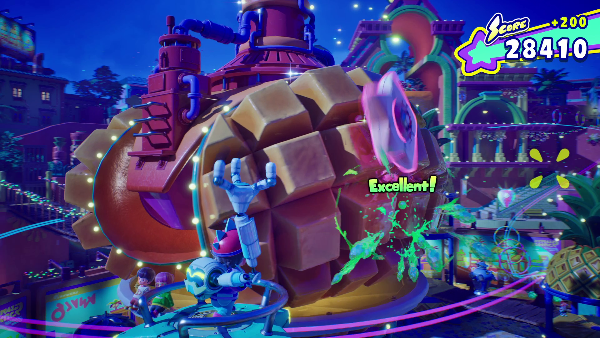 『フルーティモ! ジューシーナイトライド』は、夜のカジューンランドを舞台にしたスコアアタック型アクションゲームです。フルーツ大好き少年ビミタとアンドロイドのじいちゃんは、ドローンタクシーに乗ってコースを進みながら、フルーツを吸い込み、ゼリーを投げ、ジャンプでリングをくぐって得点を獲得します。