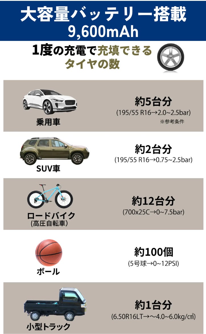 「ETENWOLF ZEPHYR V3 Pro」の最大の特徴は、9600mAhの大容量バッテリーです。この圧倒的なバッテリー容量により、一度の充電で乗用車約5台分、SUV車約2台分、ロードバイク約12台分、バスケットボール約100個もの空気充填が可能となります。