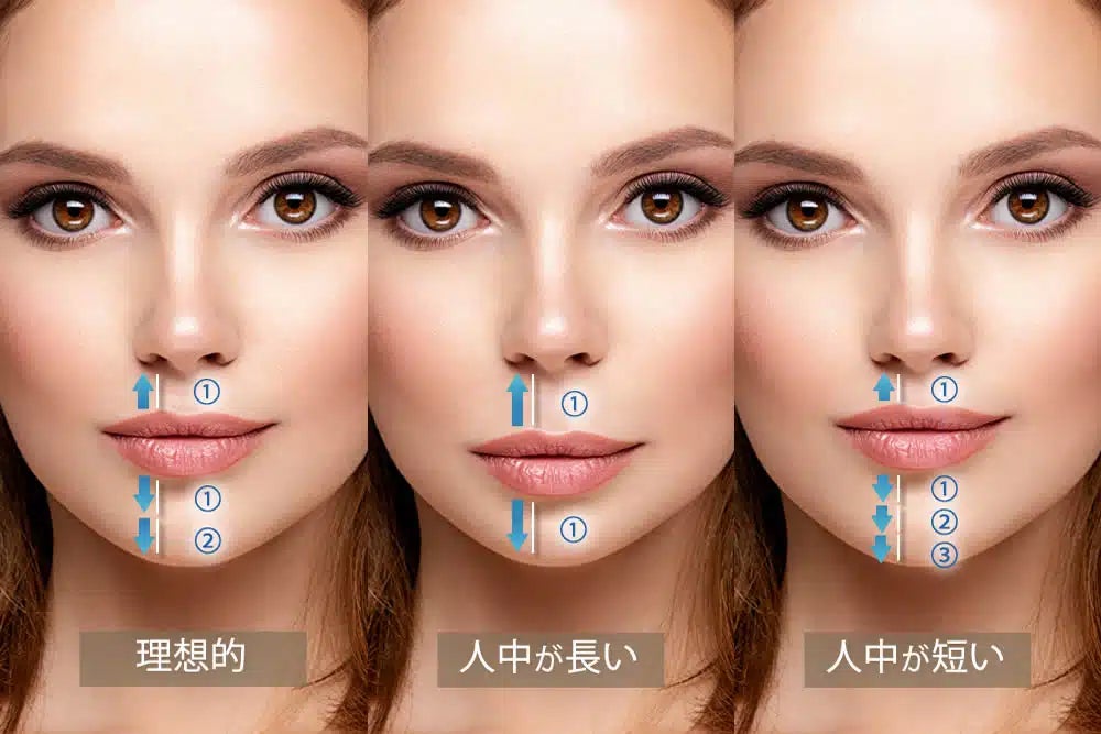 鼻と唇の間の溝を指します。 一般的には鼻下から上唇の長さと下唇からあご先の比率 が1:2であることが「黄金比」とされ、それに近いほど魅力的な顔とされています。そのため人中を短くしただけでは、美しくなるわけではなく、顔全体のバランスが非常に重要です。また、人中は加齢に伴って表情筋がゆるみ、鼻下が伸びてしまうこともあるため、人中を短くすることで若見えするとも言われています。