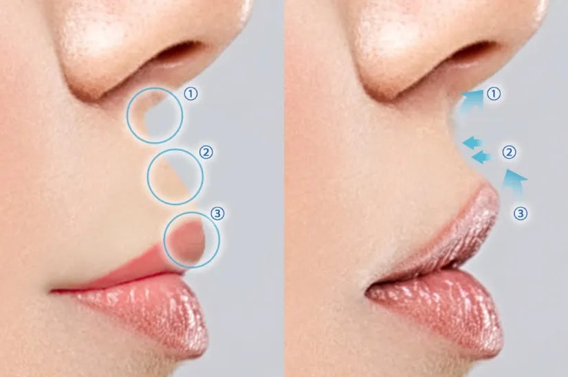 吸収性の溶ける糸を用いて、鼻下から上唇周辺の皮膚および筋肉層にかけてリフトアップを行います。鼻下の皮膚に極細の針穴を開け、そこから糸を挿入して、上唇中央部の皮膚および口輪筋にかけて糸を留めていきます。これにより、上唇が自然に持ち上がり、人中が短縮されると同時に、唇の立体感や若々しさが強調されます。
