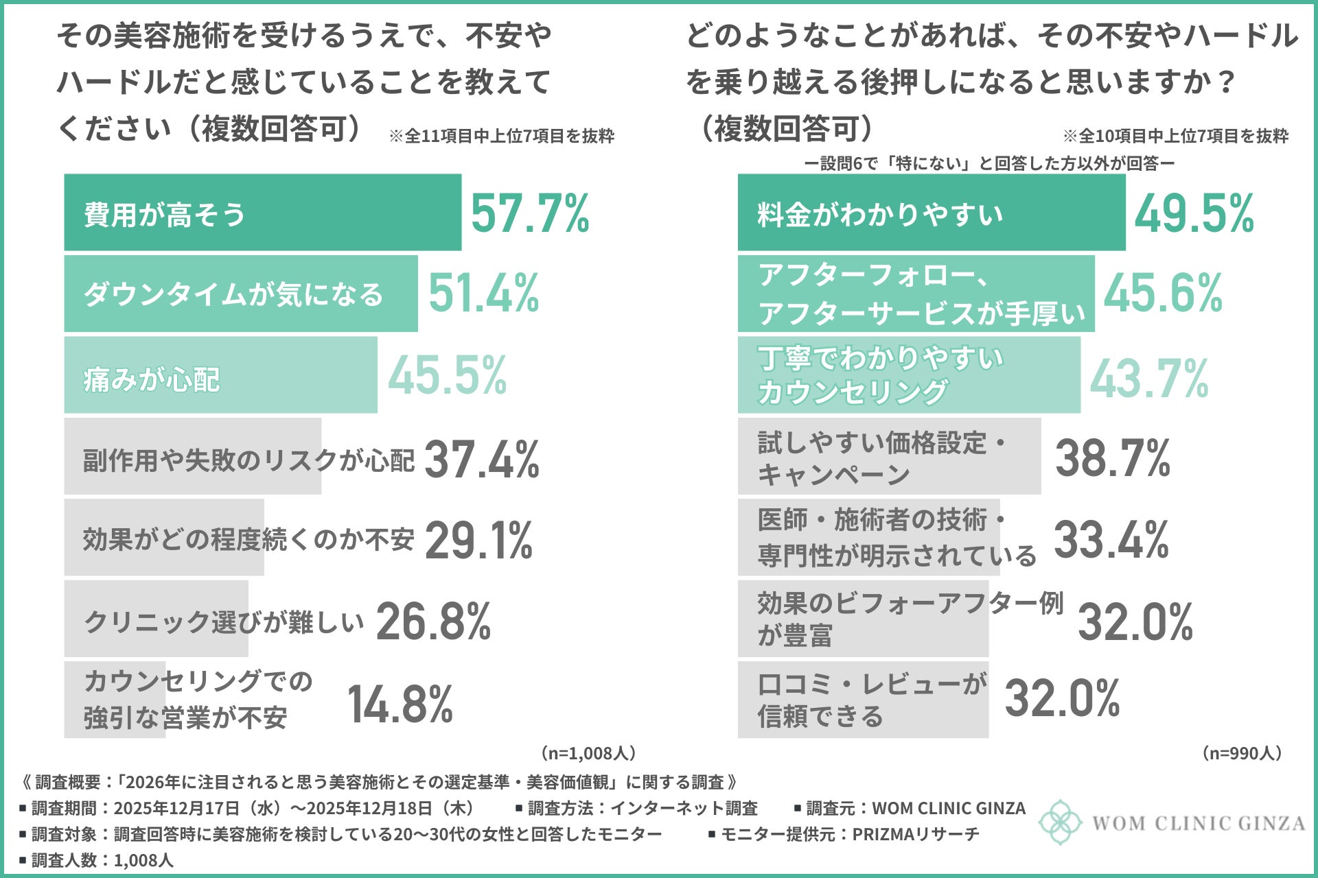 WOM CLINIC GINZA(所在地:東京都中央区、理事長:深堀 純也)は、美容施術を検討している20~30代の女性を対象に、「2026年に注目されると思う美容施術とその選定基準・美容価値観」に関する調査を行いました。