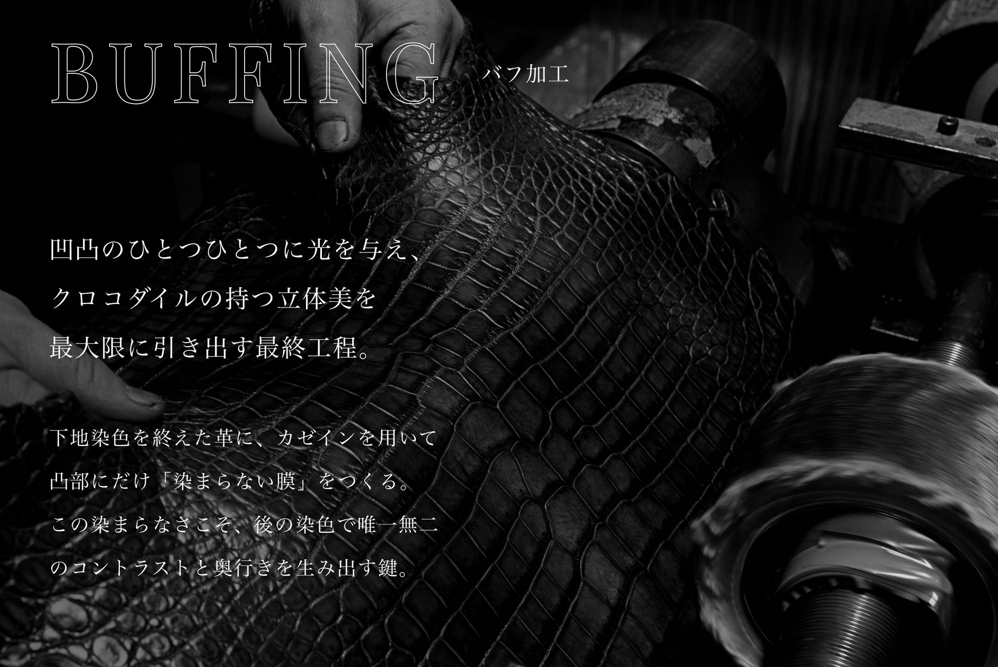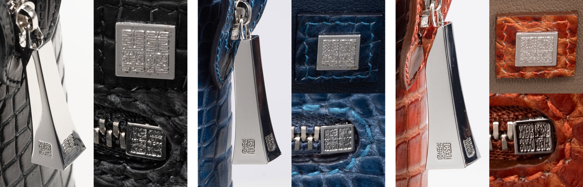 ファスナー引手は角印をイメージして作成しており、他にない重厚感のあるデザインになっています。全ての金具にマイクロポーラスメッキを施しており、通常のメッキと比べ約4倍の厚みで加工がされています。メッキの剥がれを防止し、より透明感のある光沢を実現しています。