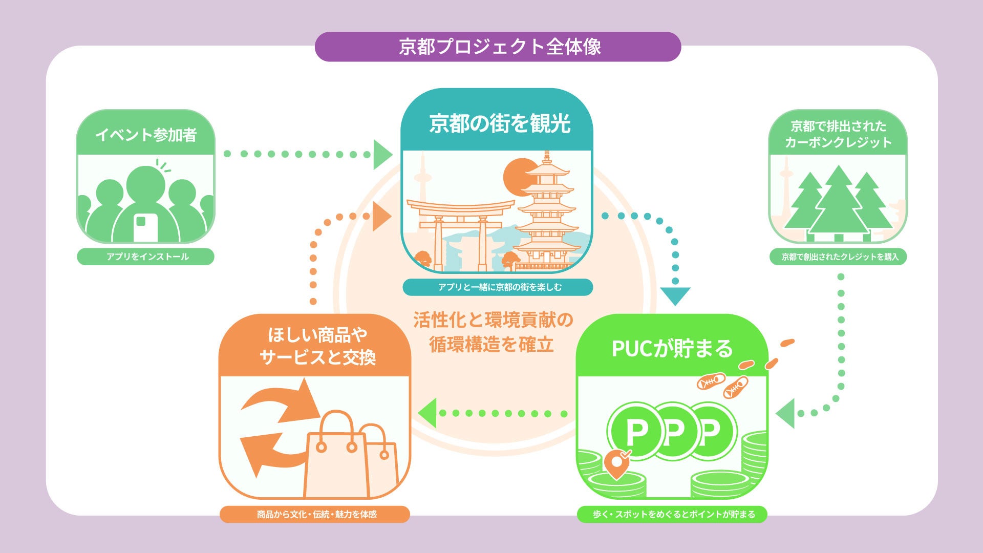 Pucreは、参加者が京都市内を歩いたり、カフェや建築スポットを楽しむことでカーボンクレジットが紐づくポイントを獲得。京都市内で市民が創出したカーボンクレジットの購入に自動的につながり、脱炭素PJを支援します。貯まったポイントはクーポンや商品と交換でき、企業は交換使用された金額分のカーボンクレジットをオフセットに活用できます。