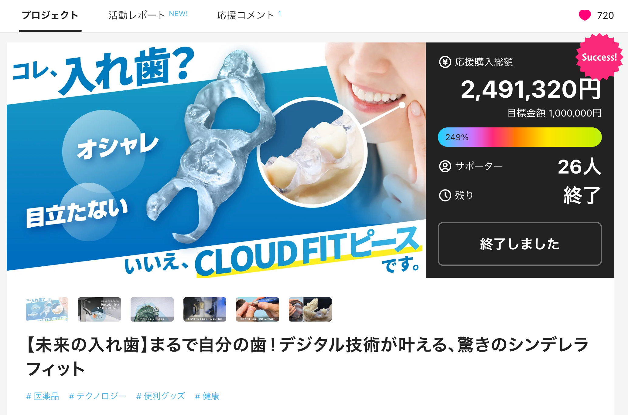 国内初となるフルデジタル技術を活用した次世代型部分入れ歯「Cloud Fit(クラウドフィット)」が、応援購入サイト「Makuake」にて2025年4月18日〜7月14日までプロジェクトを実施し、目標金額100万円を開始3日間で達成、最終的には249万1,320円(達成率249%)の支援を獲得しました。