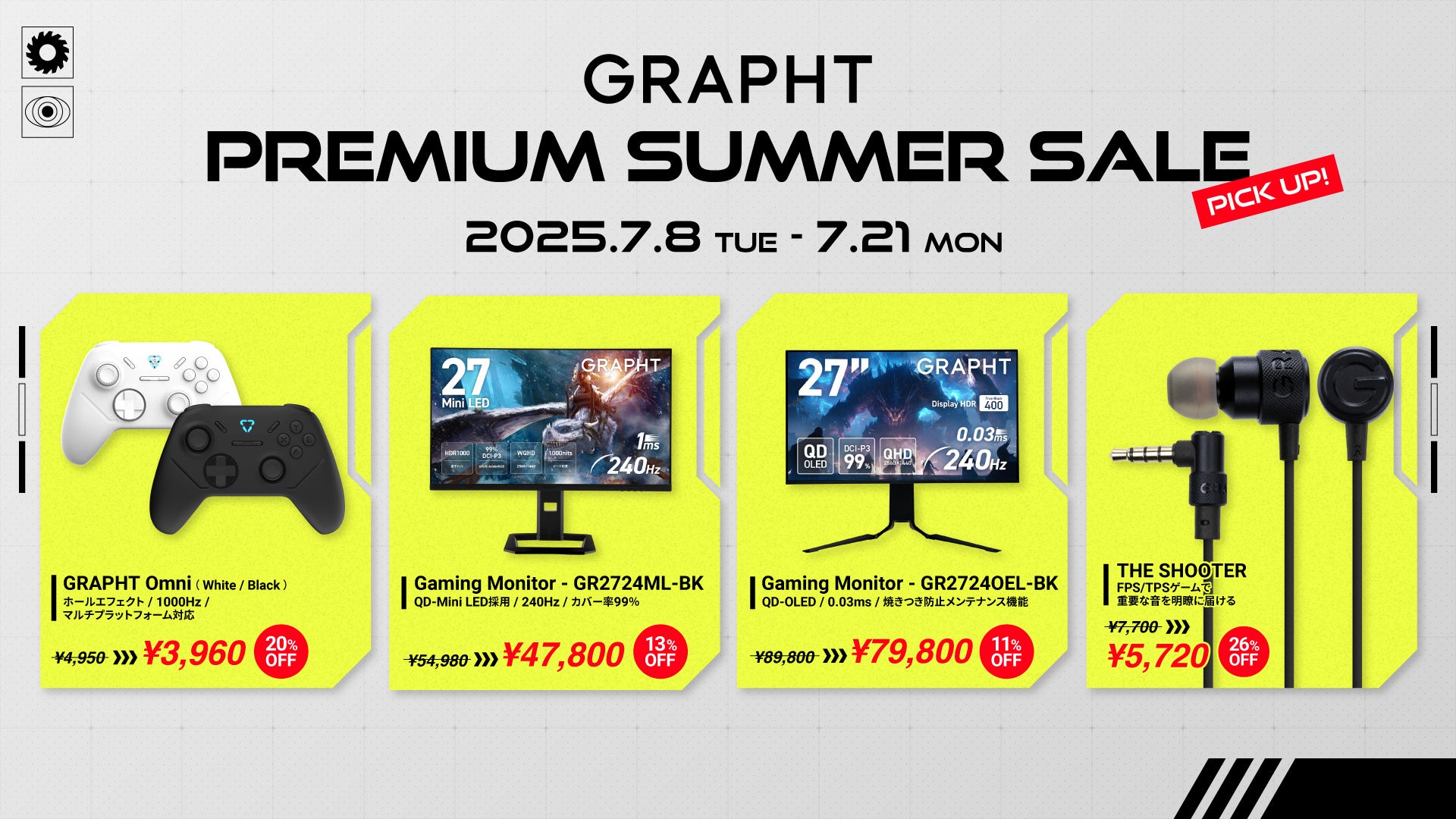 この度、2025年7月8日(火)から7月21日(月)まで『GRAPHT PREMIUM SUMMER SALE』を開催いたします。本セールは、GRAPHT OFFICIAL STORE(ECサイト)、GAMING CENTER by GRAPHT Amazonブランドストア、および全国の家電量販店やPC専門店などで一斉に実施。先日保証期間を延長したモニターに加え、ゲームパッド、イヤホンなど、ゲーミングライフをアップグレードする15製品を、最大31%オフの特別価格でご提供いたします。この機会にぜひGRAPHT製品をお得にお求めいただければ幸いです。