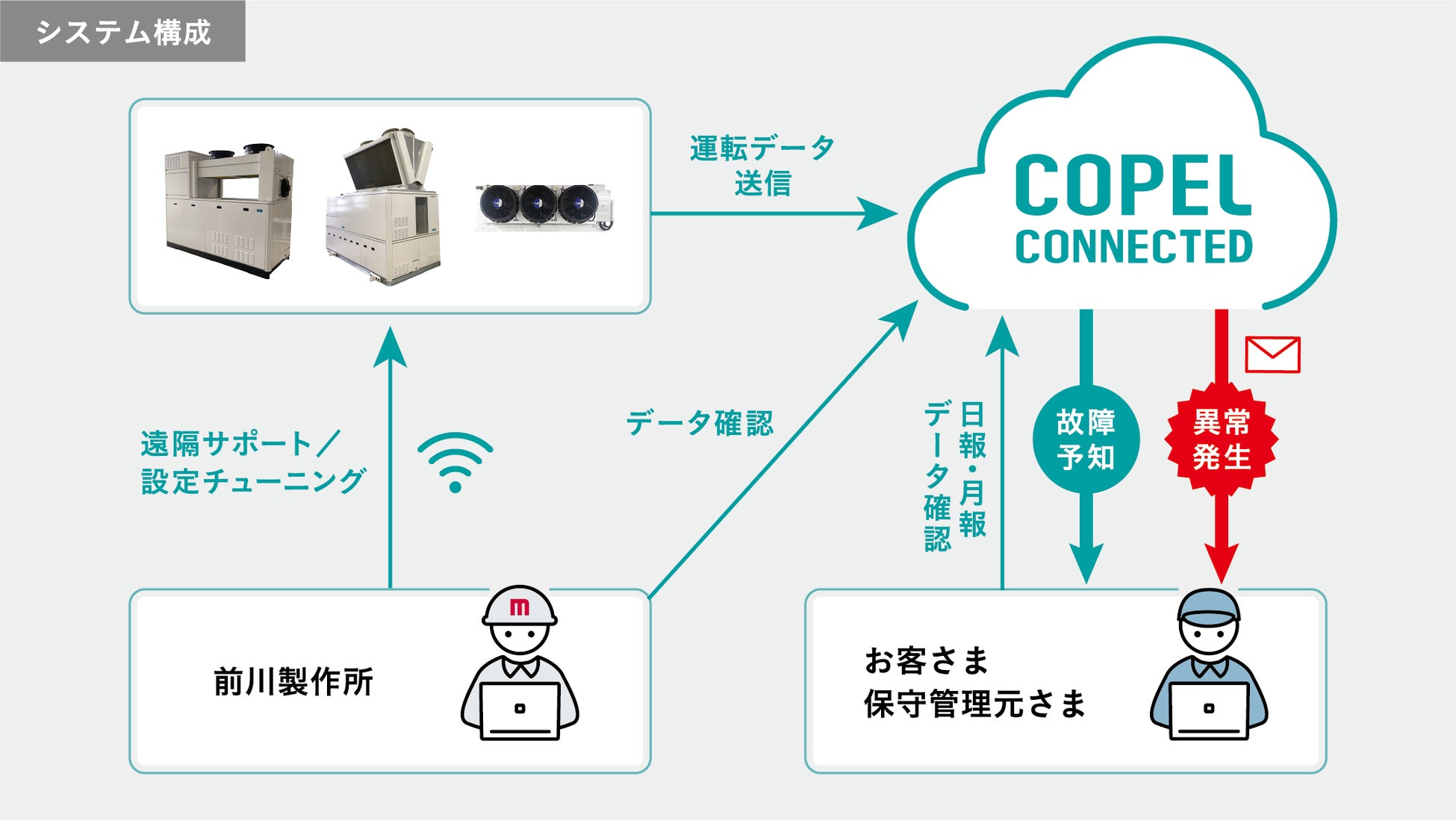 COPELの運転状況を常に管理することができ、故障予知診断や遠隔サポートによる設備の設定チューニングも可能です。