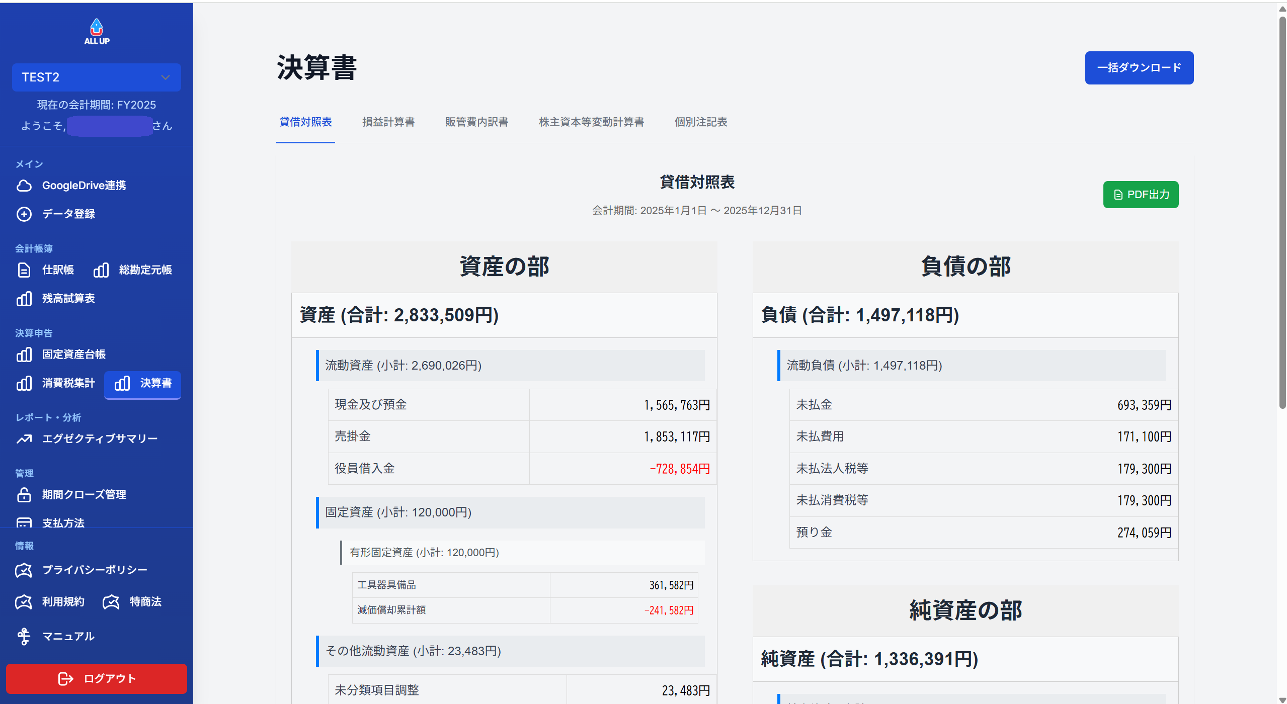 ALL-UPとは、株式会社メタアルケミストが提供する、ブラウザ上で操作でき、個人から企業まで幅広くご利用いただける包括的な財務・会計管理システムです。単純なレシートの管理から本格的な財務諸表の作成まで、お客様の会計業務全般を効率的にサポートします。