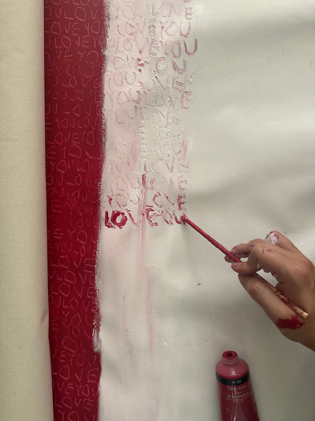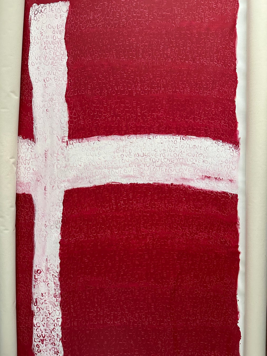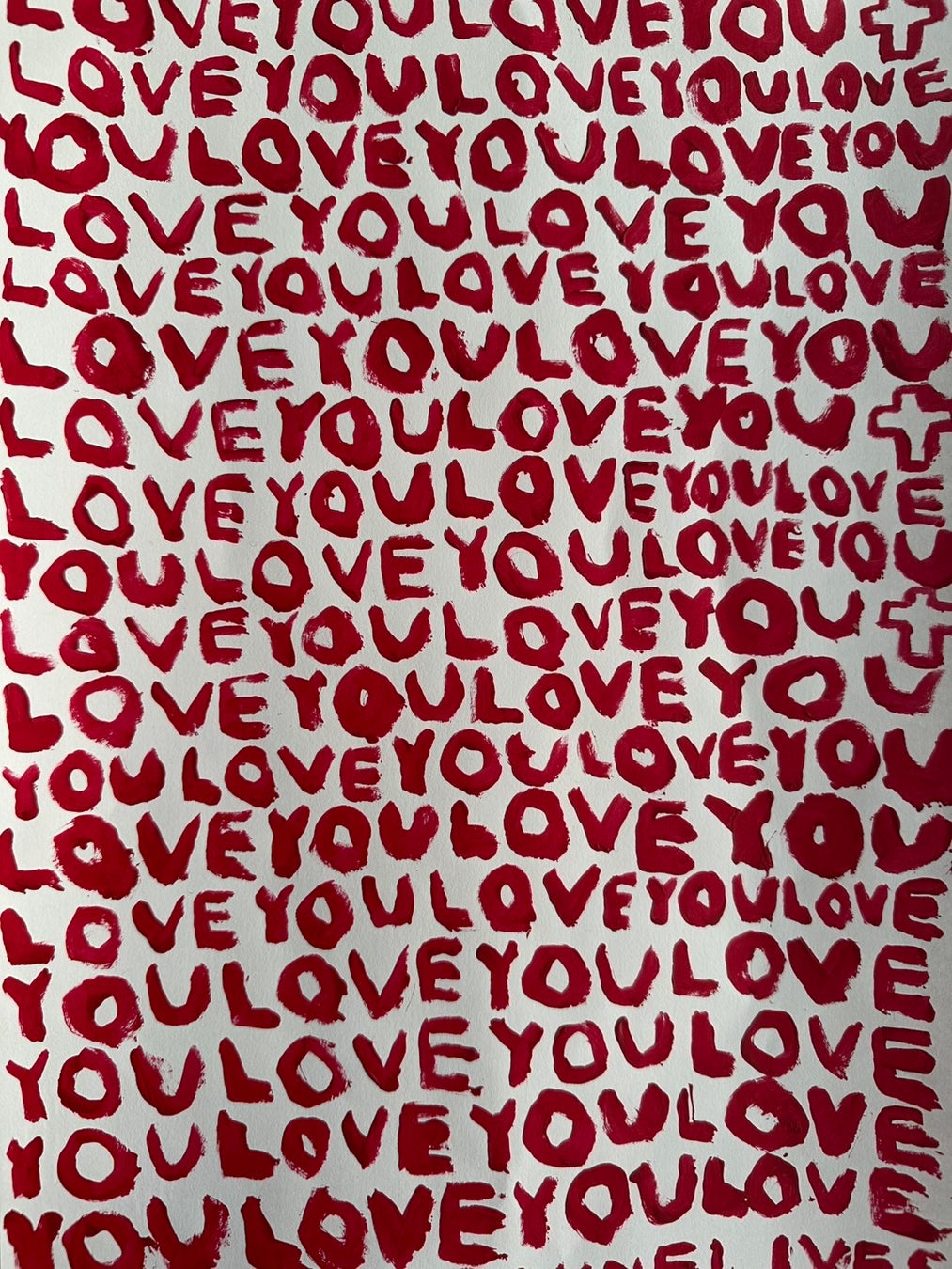 IKUMI KAKIHARA が作品の中で繰り返し描く LOVE YOU の文字や 赤い十字 は、感情や祈りを何度も呼吸するように留めようとする行為でもあります。