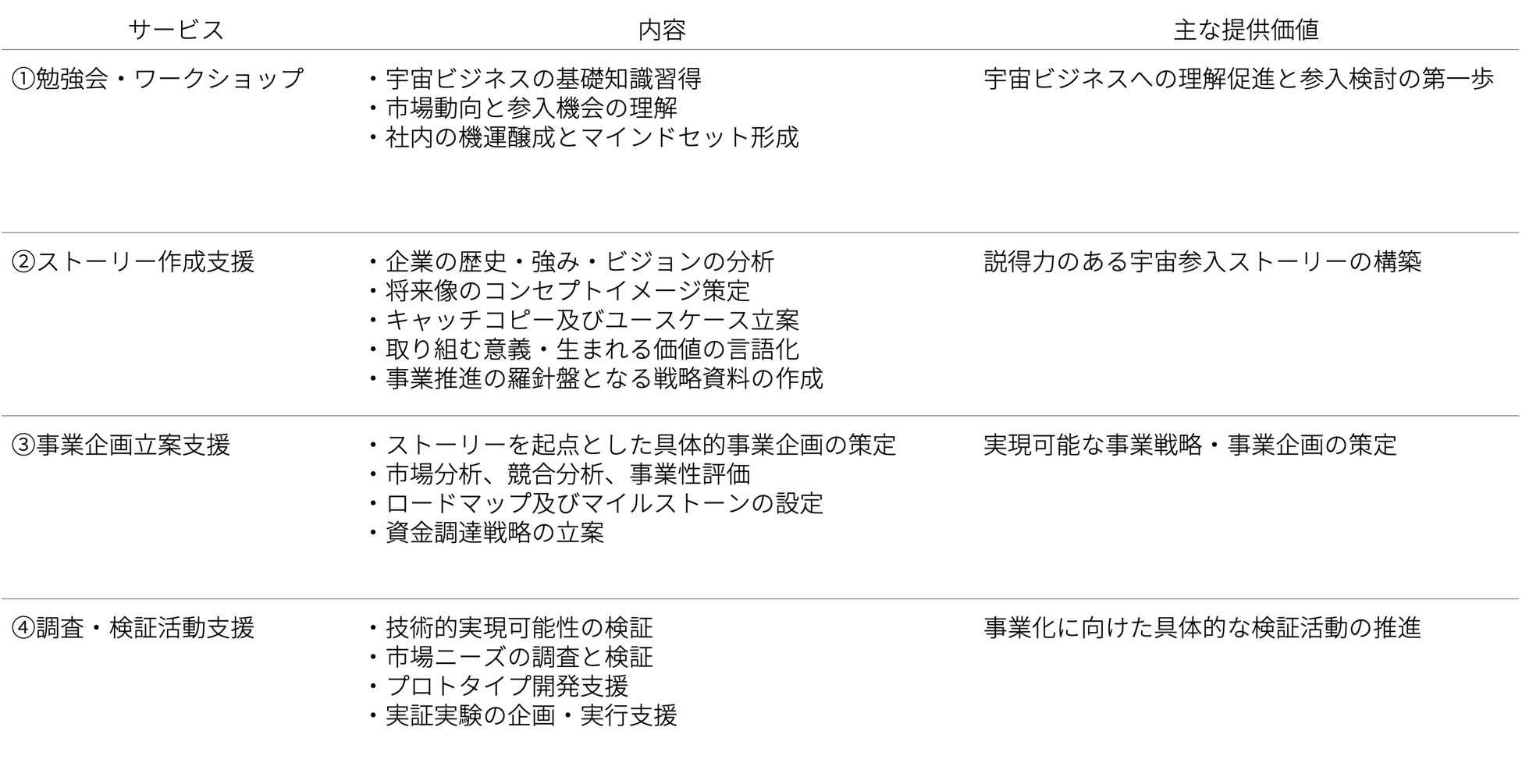 本サービスは、企業が宇宙ビジネスに参入する際の「なぜ我々が宇宙を目指すのか」という根本的な問いに答えるため、企業の歴史や強み、大切にしてきた価値観を紐解き、宇宙へと繋がる説得力あるストーリーを創出します。将来像のコンセプトイメージとキャッチコピーの策定から、具体的かつ論理的な未来のプロット及びユースケースの立案、取り組む意義や生まれる価値の言語化まで、事業開発を推進するうえでの羅針盤となるアウトプットを提供いたします。