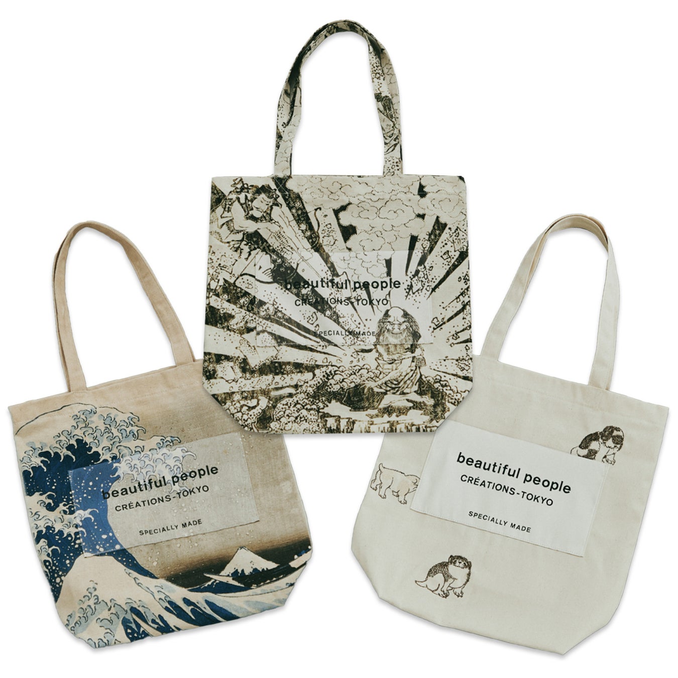 ファッションブランド beautiful people と北斎のコラボレーションによる特別なトートバッグ。北斎の美意識と現代のデザインが響き合う、日常を彩る逸品です。