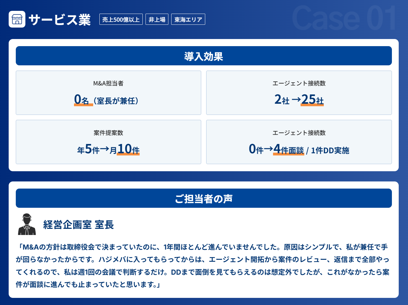 ハジメバは単に案件を探すだけでなく、「なぜ自社がこの案件を買うべきか」という買収戦略の言語化から、エージェントや売り手企業に対する提案資料・ストーリーの設計までを支援します。M&Aは戦略だけでも実行だけでも成功しません。両方を一貫して設計・実行できる体制を提供します。