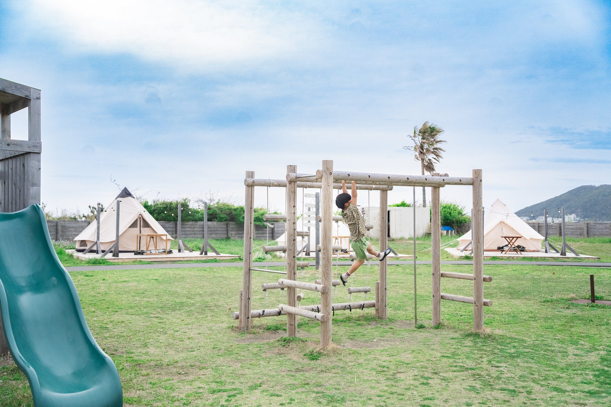キャンプサイトと遊具エリアは近接しており、保護者がテントでくつろぎながらでも子供たちの遊ぶ様子が見渡せる安心設計です。