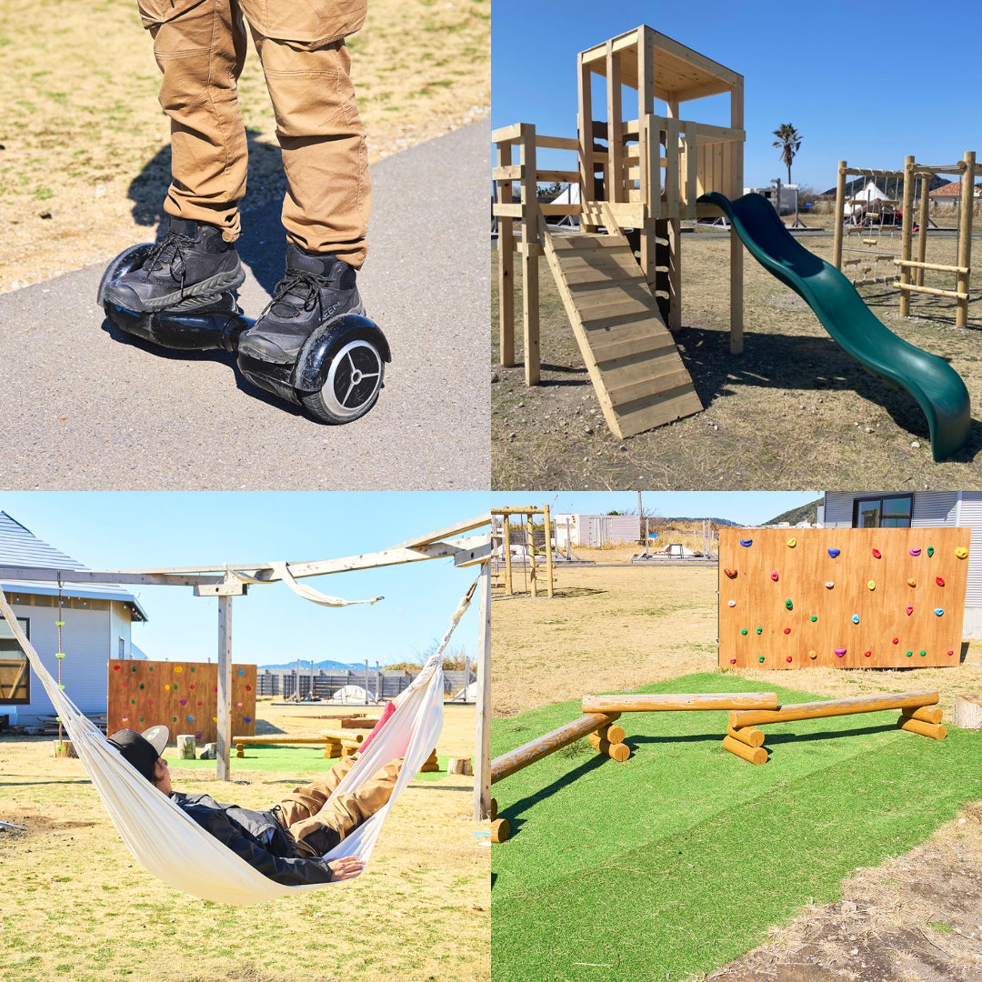 場内中央のキッズエリアには、電動バランススクーター(セグウェイ)、木製アスレチック、ハンモックブランコ、滑り台、クライミングウォール、クライミングロープ、ぶら下がりブランコ、ハンモック、ストライダー、キックスクーター、ミニサッカーゴール、バスケットゴール、砂場、平均台、モルック、カイト、各種カードゲーム、ミニ卓球台など、実際に利用できる遊具が充実しています。