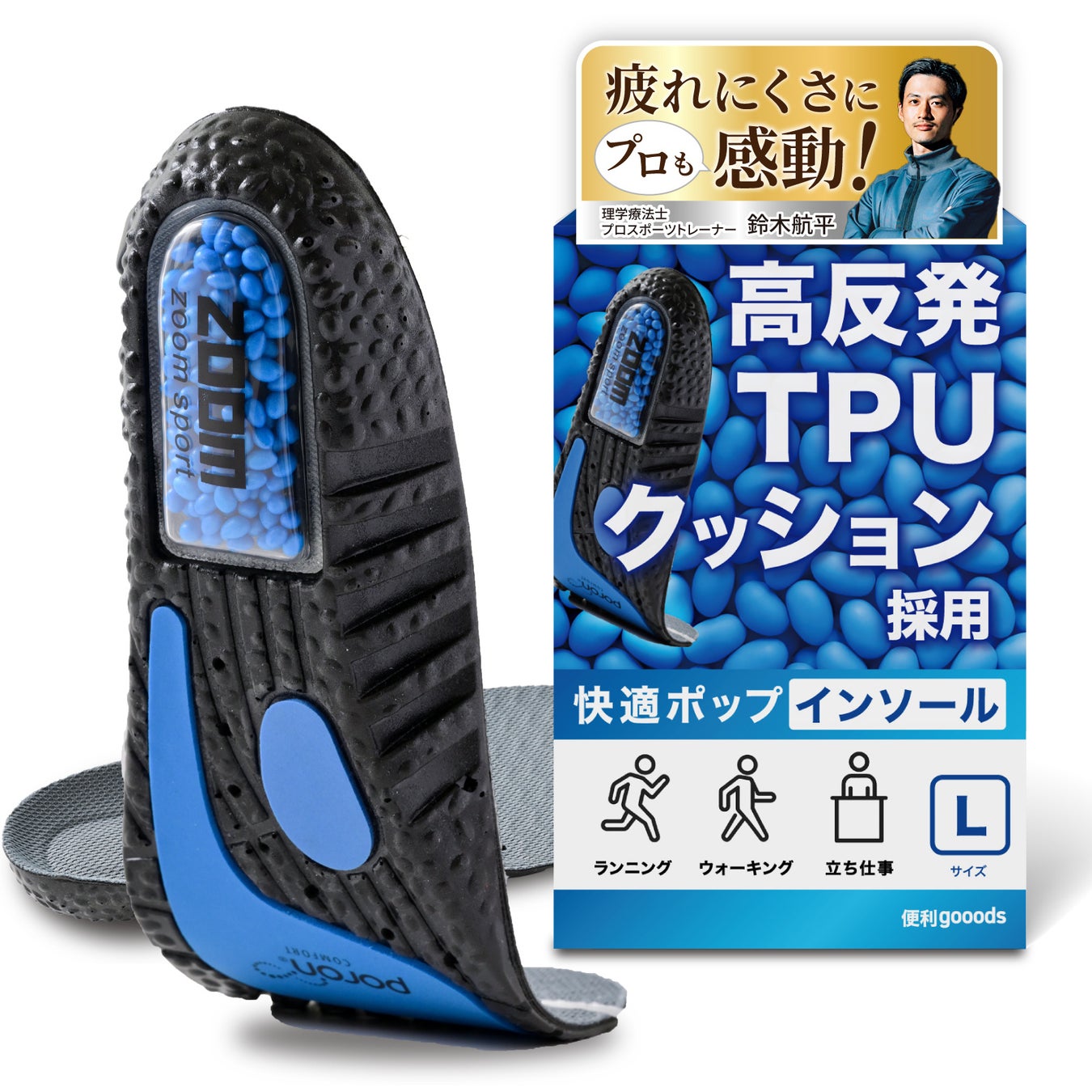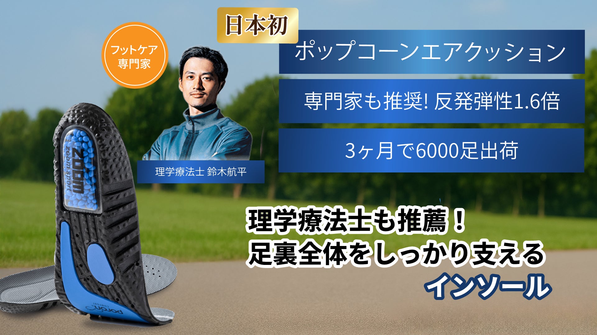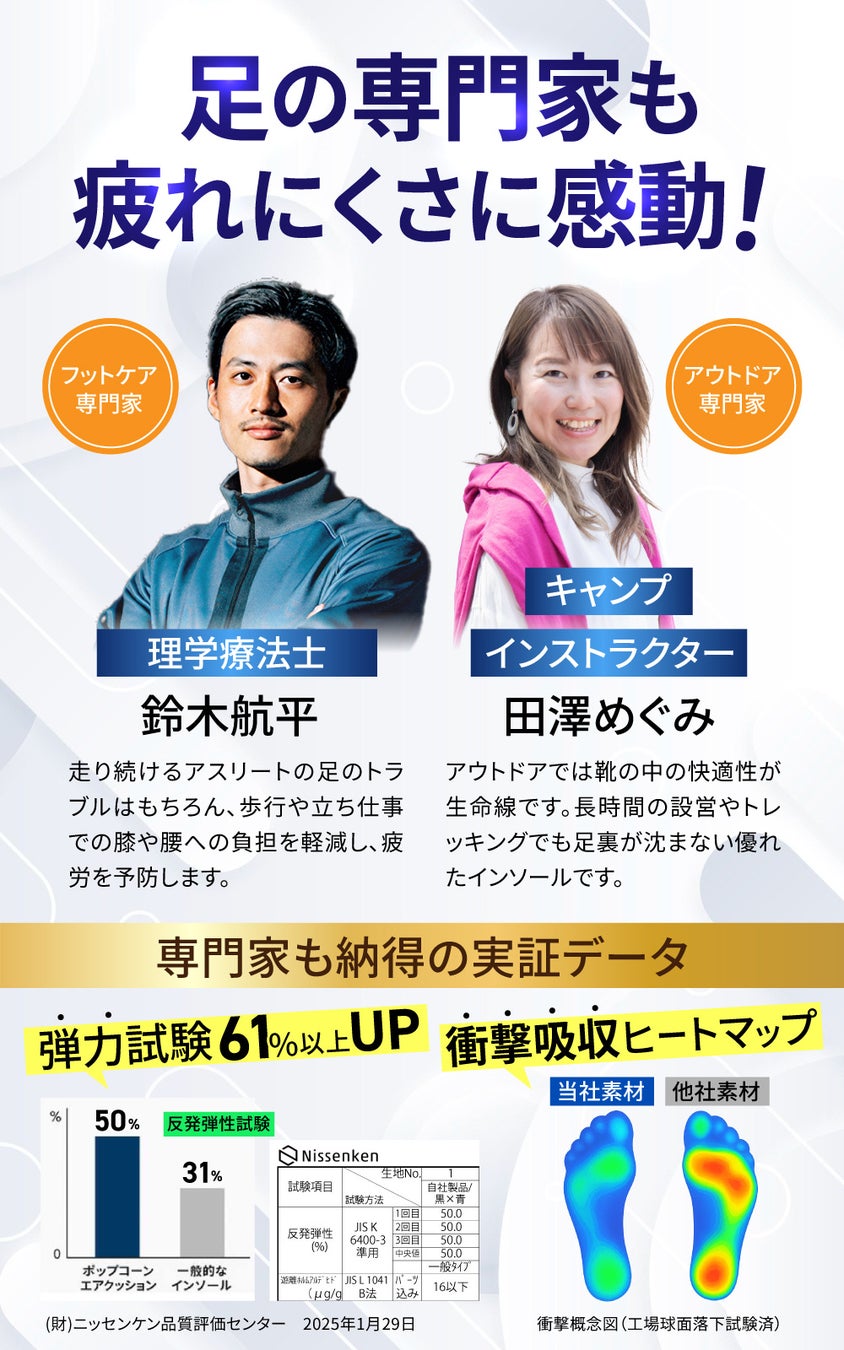 理学療法士でありスポーツトレーナーの鈴木航平氏は、「歩行時の衝撃を吸収するポップコーンエアクッションと、医療用パッド(PORONⓇ)による独自のアーチサポートで、膝や腰への負担を軽減。長時間の歩行や立ち仕事でも疲れにくい」と評価しています。専門家の推奨を受けたことで、一般ユーザーだけでなく、スポーツをする方や立ち仕事の多い方まで、幅広い層に選ばれる製品となりました。
