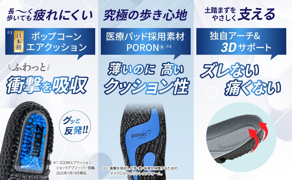 ※1: 膝や腰へのダメージを軽減するため、かかと部分にTPUペレットを封入した「ポップコーンエアクッション」(商標出願済み)を日本で初採用。