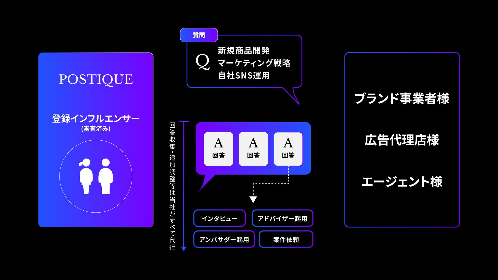 主力事業「POSTIQUE(ポスティーク)」では、従来の広告契約や投稿指示を介さず、ブランドの本当のファンであるインフルエンサーが自ら体験し、発信するUGCを創出。広告のノイズを減らし、ブランドの魅力が“本音の声”として届く循環を実現します。