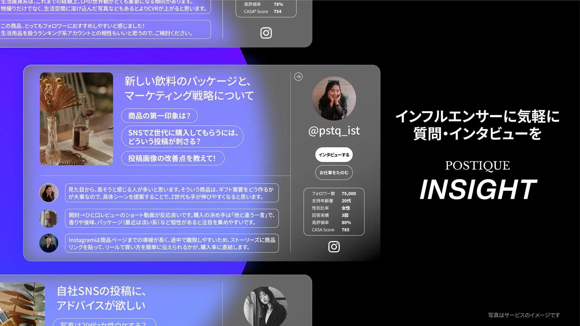 POSTIQUE INSIGHTは、生活者としての視点に加え、SNSにおける発信・共感形成の知見を備えたインフルエンサーから、商品開発・ブランド/SNS改善の意思決定に資するインサイトを収集できる新たな手法として、複数の事業者様にご利用を開始いただいております。