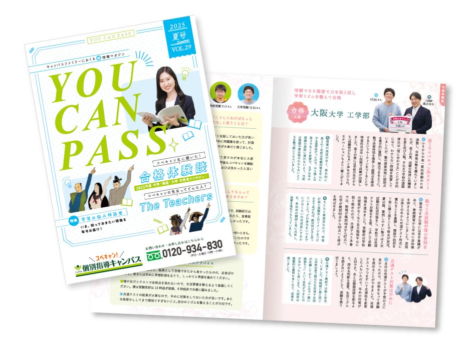 今、資料をご請求いただいた方や教室見学にお越しいただいた方には、個別指導キャンパスのミニ情報誌『YOU CAN PASS』をお渡し中です! 志望校に合格した生徒様と担当教室長の長文インタビューや、学習のお悩み相談などがお読みいただけます。