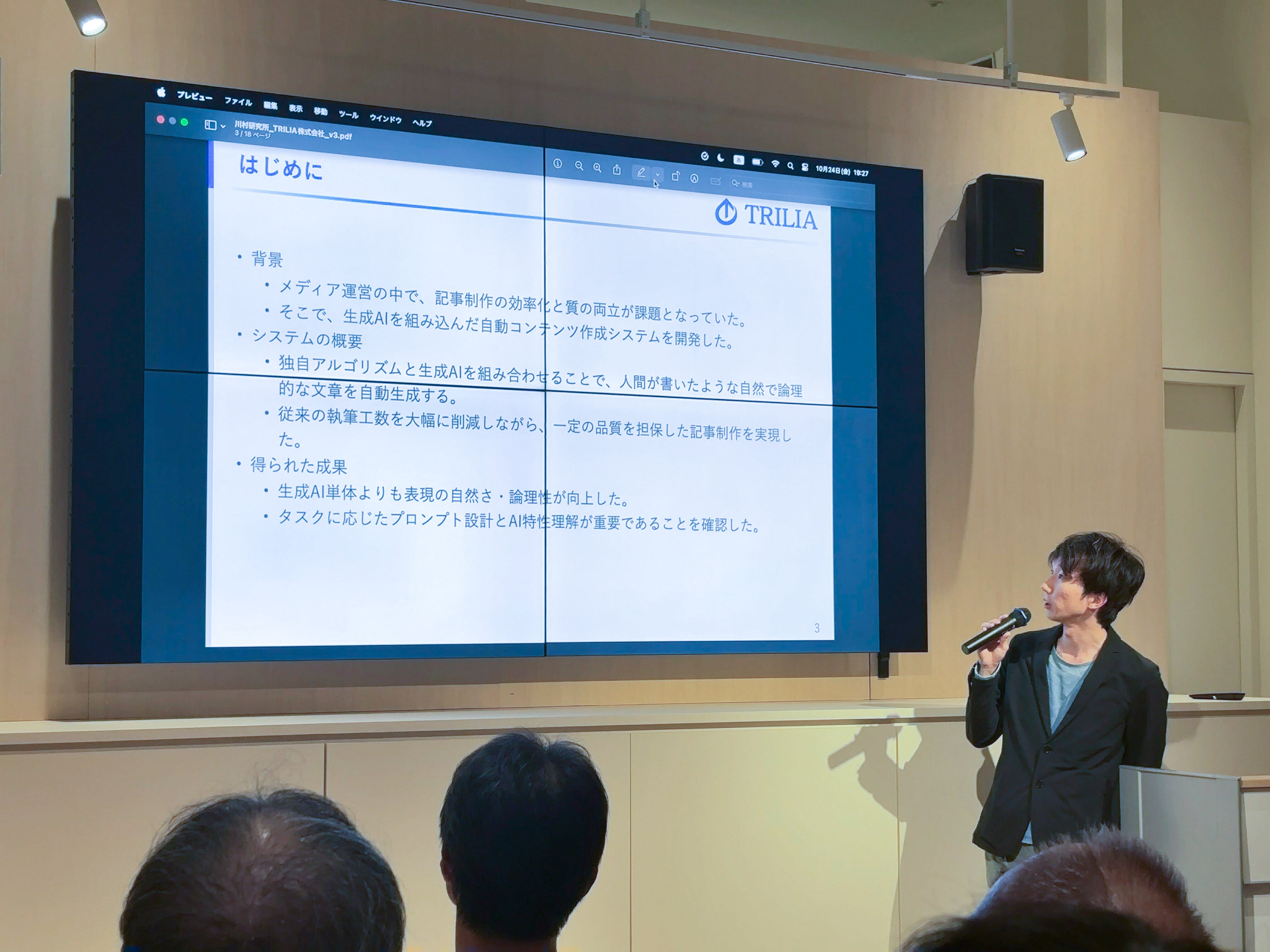 TRILIA株式会社(本社:東京都新宿区、代表取締役社長:櫻木勝貴)のCTO 加藤 祐基が川村研究所(北海道大学大学院情報科学研究院 調和系工学研究室)の研究発表会において、Webマーケティング現場におけるAI活用の取り組み事例について発表しました。