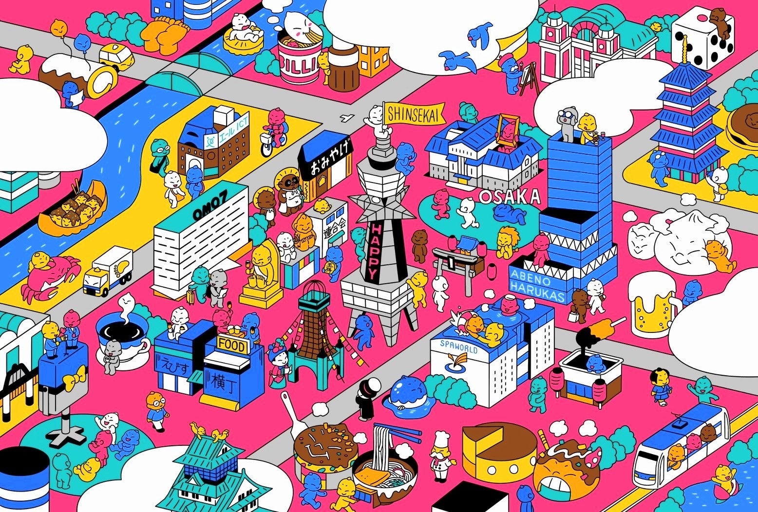 6つのスタンプを重ねるとビリケンさんの街が完成。スタンプは、人気イラストレーター・ノダ タカヒロ氏によるビリケンとエリアのランドマークの描き下ろしアート!