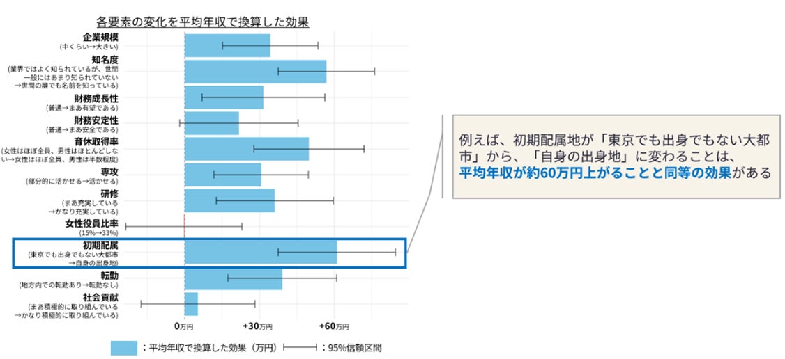 ・企業プロフィールや採用条件など、企業の各要素が改善した場合の効果を平均年収に換算したところ、初期配属地が「東京でも出身地でもない大都市」から、「自身の出身地」に変わることは、平均年収が約60万円上がることと同等の魅力度向上の効果があることが示されました(図1)。