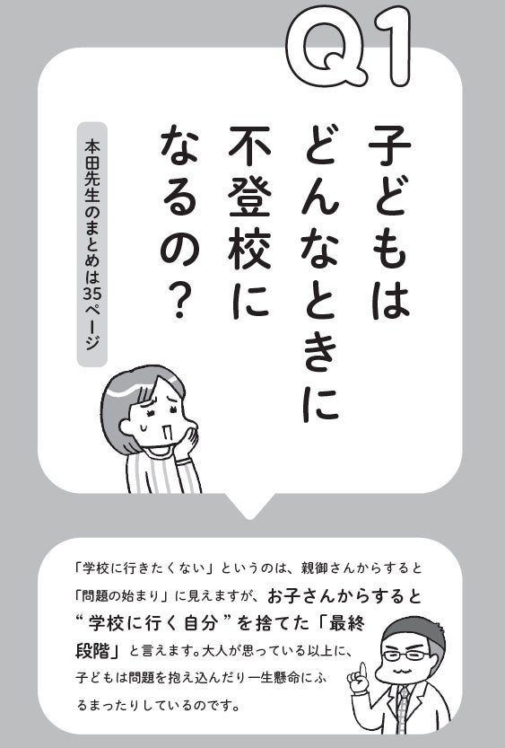 ▼不登校の経緯を15の相談例で紹介。イラストはフクチマミさん