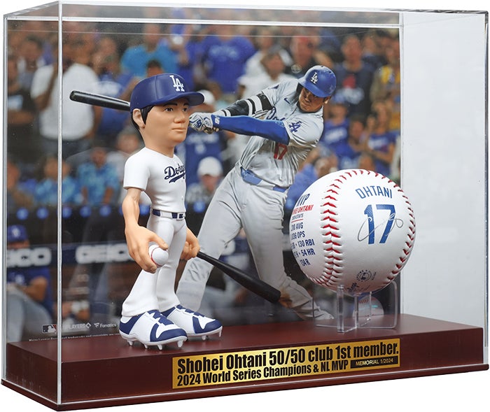 50号ホームランの瞬間を捉えた躍動感あふれるMLB公式フォトをバックにボールには大谷翔平の背番号にサイン。さらに2024年の活躍が一目でわかる解説や唯一無二の記録がボールに刻まれた記念ボール。その脇を固めるデフォルメフィギアは存在感抜群!!たった2024セットしか存在せず、世界に一つのシリアルナンバーが刻印されています。大谷翔平の偉業を称えるファン必見のコレクターズアイテムを永久保存版としてぜひ手に入れてください!