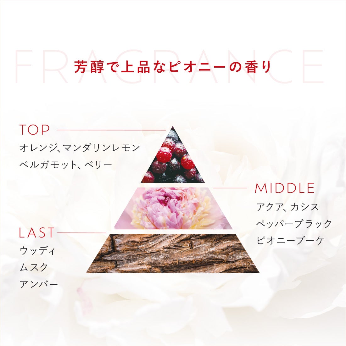 穏やかな甘さのピオニーが広がる、やさしいフローラルの香り。