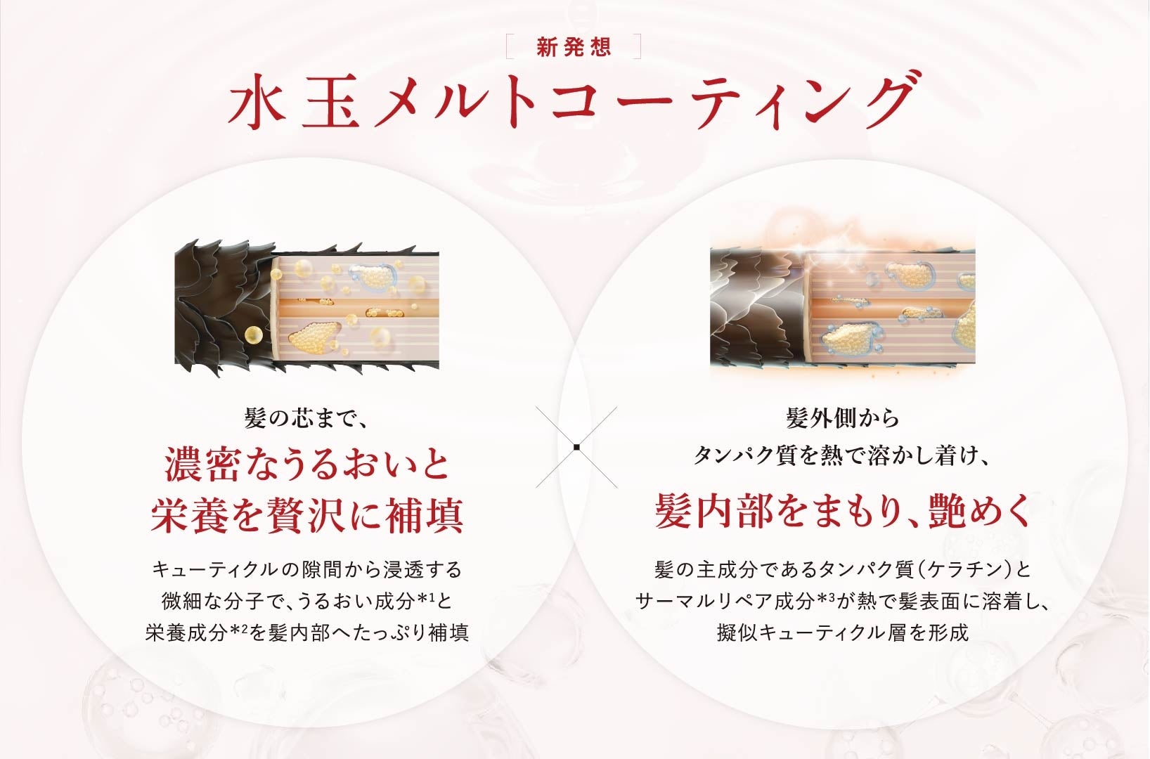「髪の芯まで濃密なうるおいと栄養を満たしながら、髪表面を擬似キューティクルでコーティング」する独自発想の『水玉メルトコーティング』によって、内側からもっちりとしたハリとコシ、そしてサロン帰りのようなツヤとまとまりを目指します。