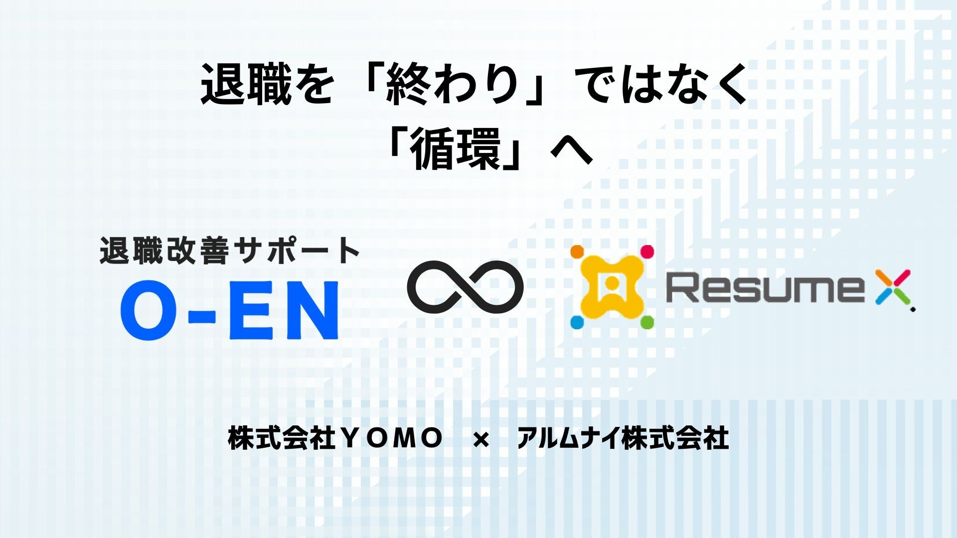 企業向け退職サポートサービス「O-EN(オーエン)」を運営する株式会社YOMO(本社:大阪府、代表取締役:髙谷浩太)は、アルムナイプラットフォーム「ResumeX(レジュメックス)」を提供するアルムナイ株式会社(本社:東京都、代表取締役:秋田叔之)と業務提携いたしました。