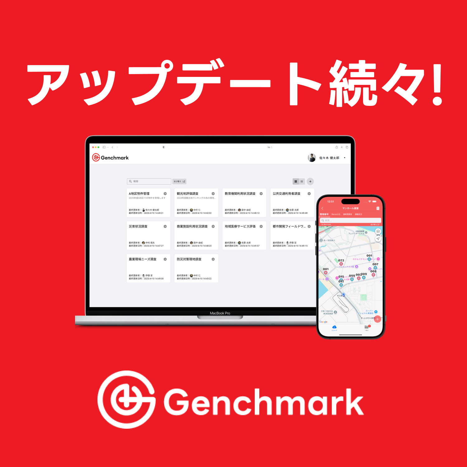 『Genchmark(ゲンチマーク)』はWebアプリとモバイルアプリを組み合わせた現場調査専用のクラウド型アプリケーションです。位置情報を基に現地で収集したデータをクラウド上でリアルタイムに共有し、チーム全体の効率を最大化します。建設業界をはじめ、環境調査やインフラ点検など、幅広い業界での活用が期待されています。