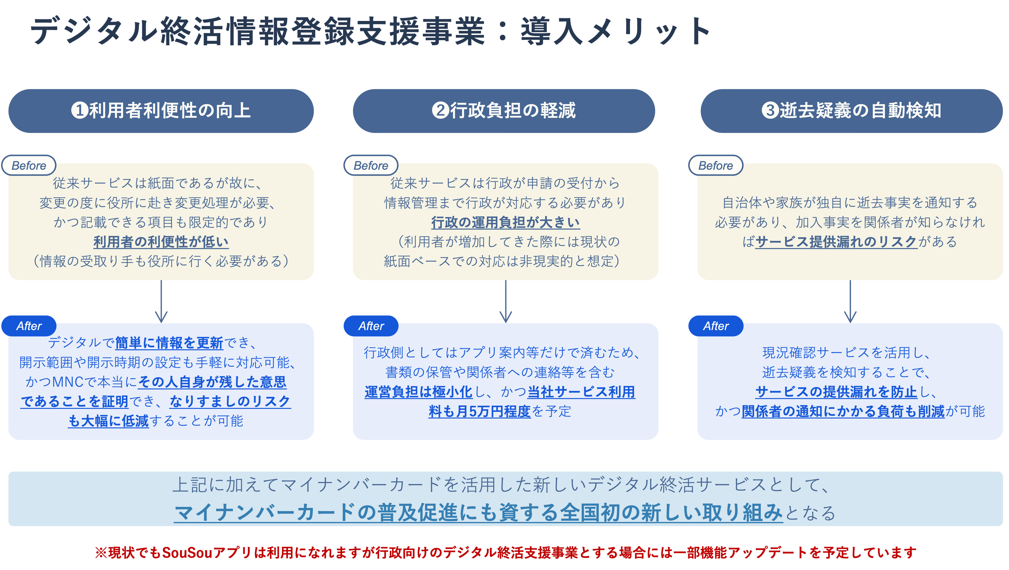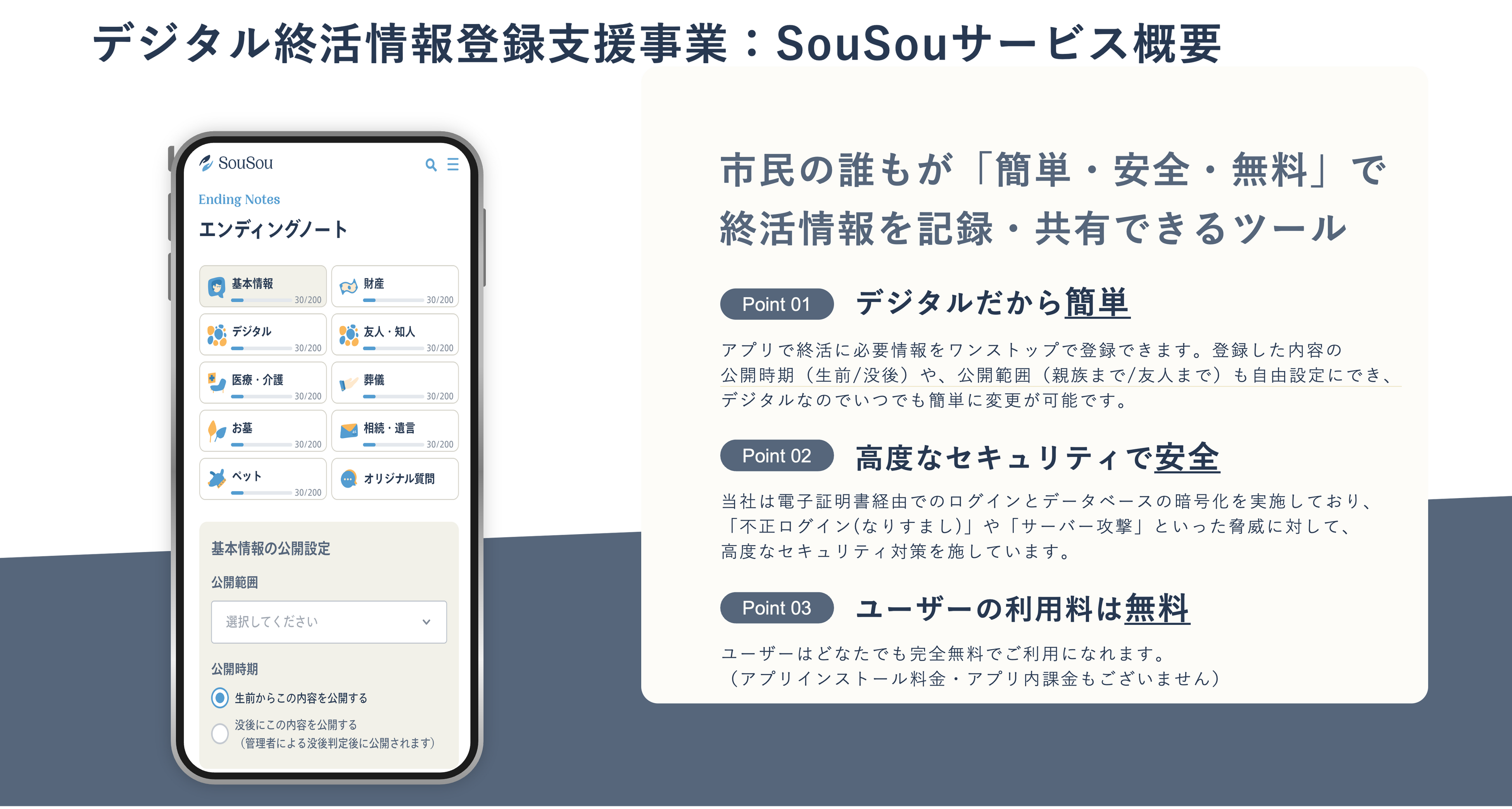 当社は、自社サービスであるエンディングプラットフォーム「SouSou」を活用することで、この仕組みをスムーズにデジタル化することができることを提案。誰もがスマートフォンアプリから終活情報を登録・更新できるようになる上に、「SouSou」の特徴である