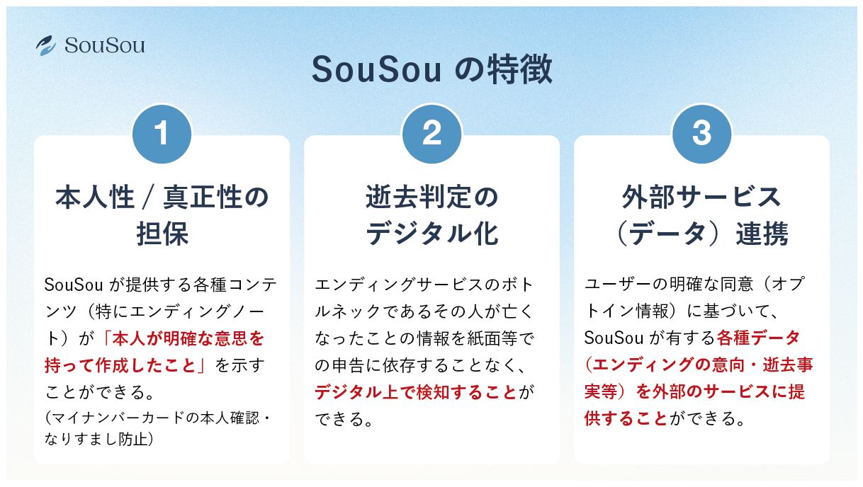 「SouSou」はマイナンバーカードを活用した新しいデジタル終活サービスです。エンディングノート等の終活に必要な様々な機能を、アプリ利用料金完全無料・ワンストップで提供します。また従来のサービスにはない「①.本人性/真正性の担保」・「②.逝去判定のデジタル化」・「③.外部サービス(データ)連携」という3つの特徴を備えており、今後は様々なパートナー企業との連携を通じて、ご逝去後の各種手続きの自動化・簡略化を目指します。