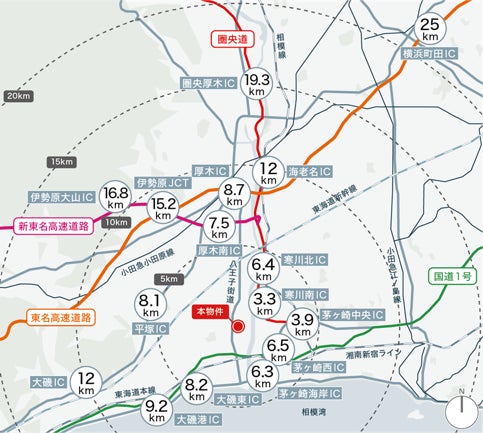 本計画地は寒川南ICまで約3.3km、厚木南ICまで約8.7kmに位置し、中部圏・近畿圏と首都圏間を結ぶ玄関口として、広域配送に適した好立地です。また、主要道路の国道129号や国道1号へのアクセスが良好な立地を生かし、神奈川県全域への高頻度配送が可能となります。