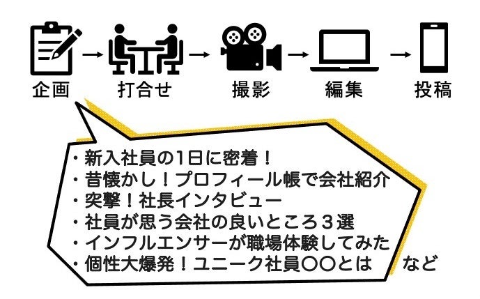 「企業の裏側に潜入」、「先輩社員にどんな会社か聞いてみた!」、「インフルエンサーが職場紹介!」など、通常のリクルート情報では表現できない共感力の高い動画を制作していきます。