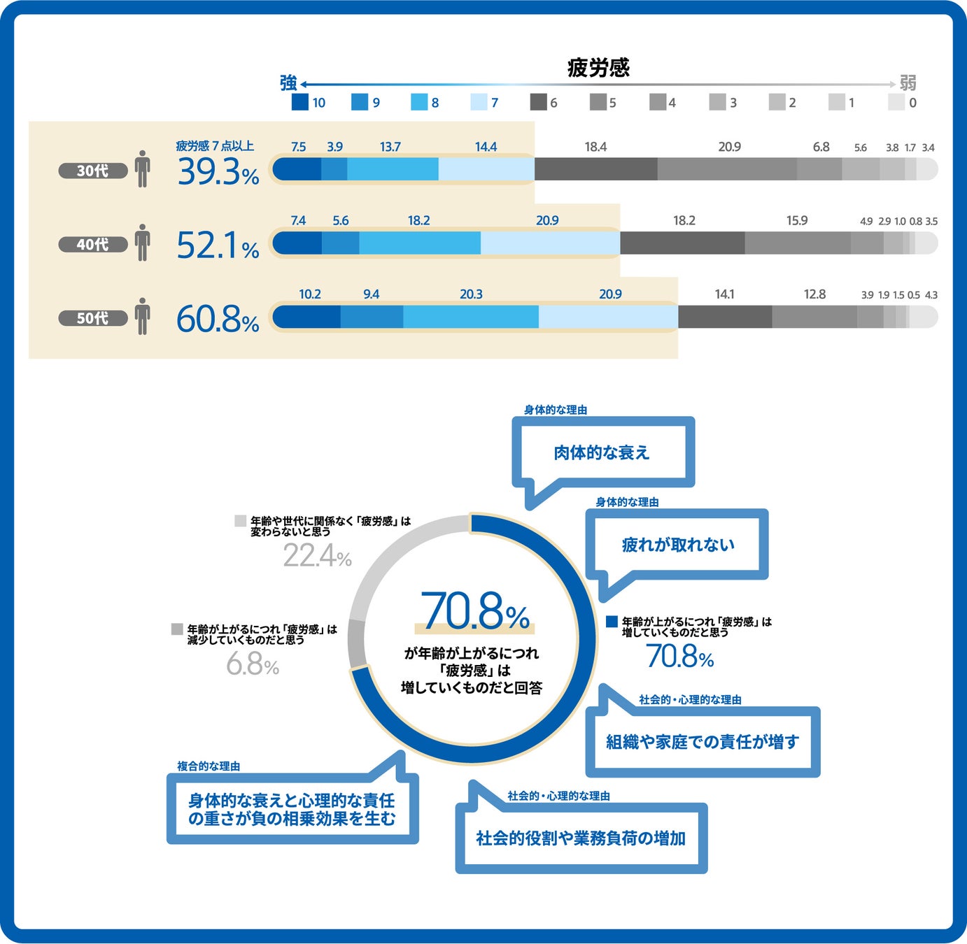現代人の70.8%が年齢とともに「疲労感は増していく」と回答し、主に「体力の衰えや回復力の低下」と「仕事上の責任や心理的負荷の増大」が要因であることが分かり、年齢とともに職場と家庭の両方で背負う社会的・心理的な負荷が増大していくことが影響していると考えられます。
