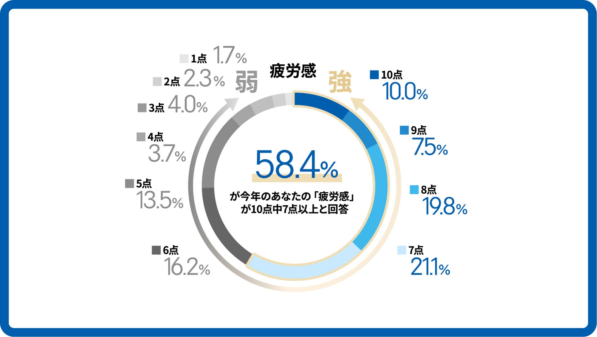 回答者の58.4%が7点以上の強い疲労感を感じていると自己評価し、「疲労感」を感じることは当たり前になっている現状が明らかになりました。