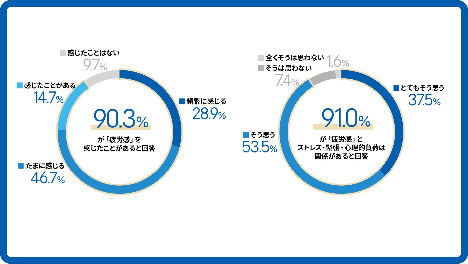 疲労のほかに「疲労感」を感じたと回答した人が合計90.3%に上り、ほとんどの現代人が日々「疲労感」に苛まれていることが判明しました。「疲労感」を感じた91.0%がストレス・緊張・心理的負荷と関係していると実感し、社会人の抱える「疲労感」は、単なる身体的な消耗からではなく、「精神的なストレスによる問題」が深く根ざしている実態が浮き彫りになりました。