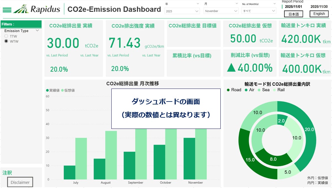 郵船ロジスティクス株式会社(社長:原秀則)は、Rapidus株式会社(代表取締役社長兼CEO:小池淳義 以下、Rapidus)の依頼を受け、2025年5月からプロジェクトチームを立ち上げて、環境負荷低減を徹底的に追求するロジスティクスの実現に向けた取り組みを推進してきました。この取り組みの一環として、2025年11月より、Scope 3におけるCO2e⁽*⁾排出量削減効果を可視化する革新的なダッシュボードの提供を開始しました。