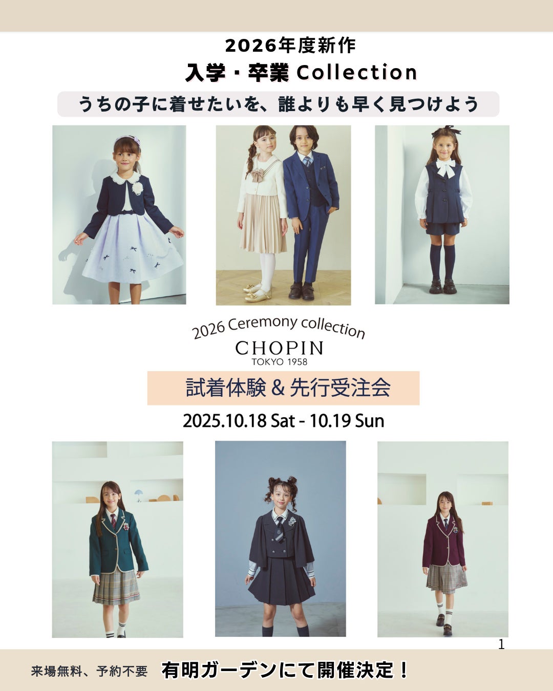 株式会社キャット(代表取締役社長 柳澤誠治)は、2025年10月18日(土)・19日(日)の2日間、東京・有明にある複合商業施設「有明ガーデン」にて、キッズフォーマルブランド CHOPIN(ショパン) の 2026年新作入学・卒業式服コレクションの試着体験および先行受注会を開催いたします。