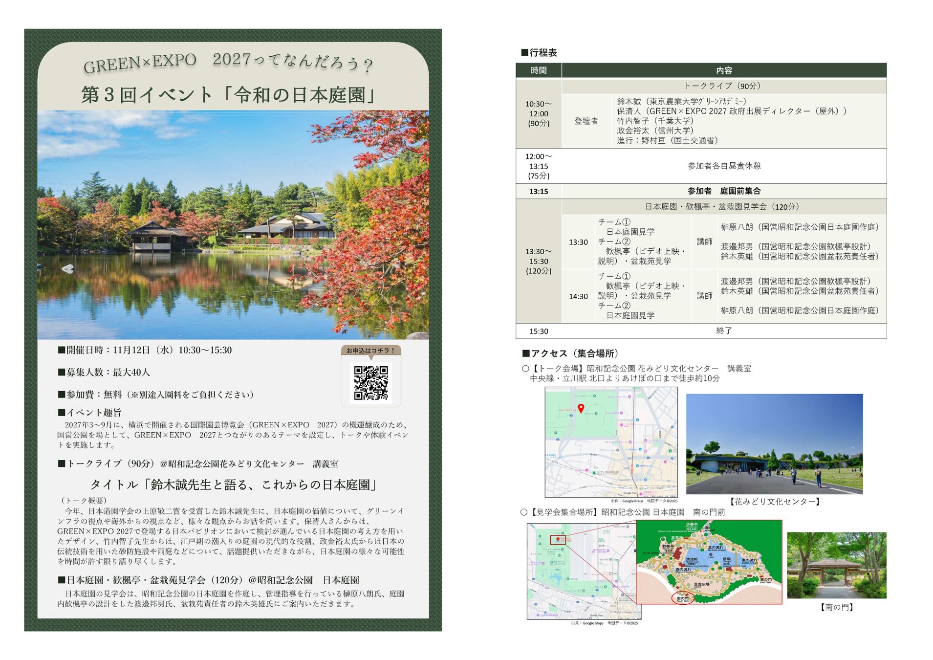 11月12日(水)に、2027年に横浜で開催される国際園芸博覧会「GREEN×EXPO 2027」を盛り上げるイベントの第3弾を国営昭和記念公園で開催します!