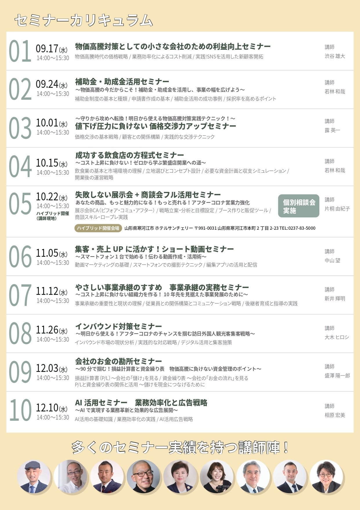 10月22日(水)開催の「失敗しない展示会+商談会フル活用セミナー」は、講師が現地(山形県寒河江市 ホテルサンチェリー)に登壇するハイブリッド形式で開催され、参加者には個別相談会の機会も提供されます。